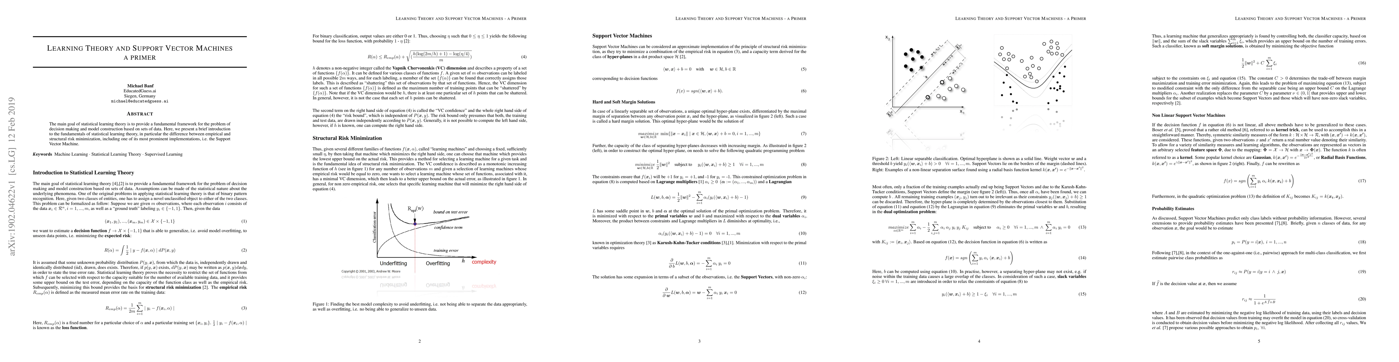 The main goal of statistical learning theory is to provide a fundamental framework for the problem of decision making and model construction based on sets of data. Here, we present a brief introduction to the fundamentals of statistical learning theory, in particular the difference between empirical and structural risk minimization, including one of its most prominent implementations, i.e. the Support Vector Machine.