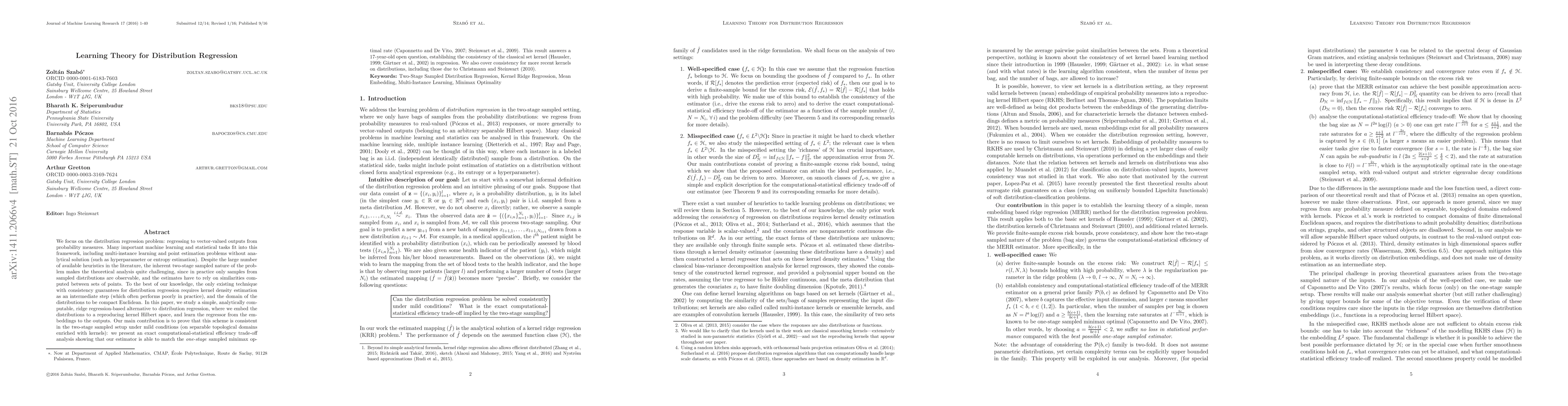 The paper proposes a learning theory for distribution regression, focusing on regressing to vector-valued outputs from probability measures. It introduces a ridge regression-based alternative to distribution regression, embedding distributions into a reproducing kernel Hilbert space (RKHS) and learning the regressor from these embeddings to the outputs.
