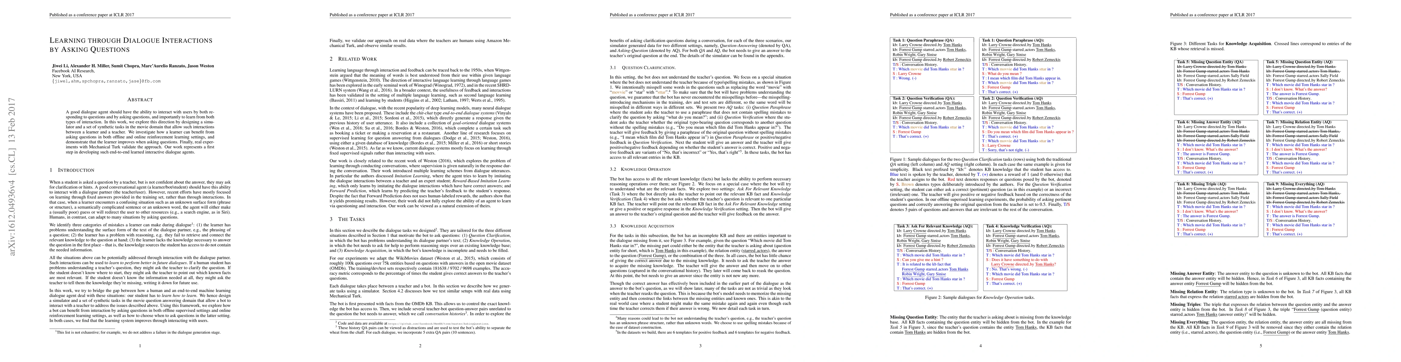 A good dialogue agent should have the ability to interact with users by both responding to questions and by asking questions, and importantly to learn from both types of interaction. In this work, we explore this direction by designing a simulator and a set of synthetic tasks in the movie domain that allow such interactions between a learner and a teacher. We investigate how a learner can benefit from asking questions in both offline and online reinforcement learning settings, and demonstrate that the learner improves when asking questions. Finally, real experiments with Mechanical Turk validate the approach. Our work represents a first step in developing such end-to-end learned interactive dialogue agents.