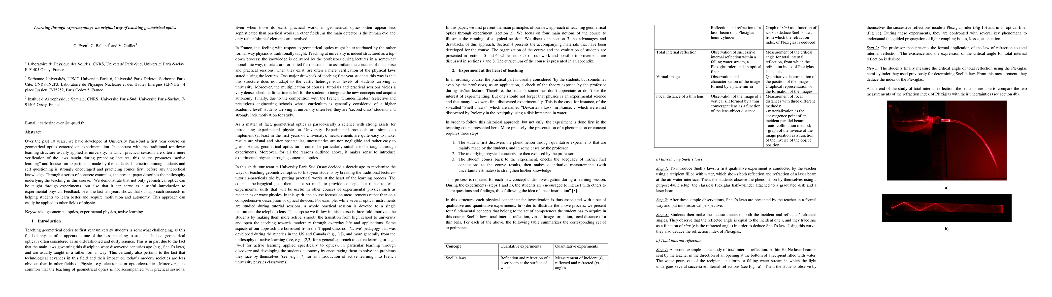 This paper describes a novel experimental-based approach to teaching geometrical optics at University Paris Sud, emphasizing active learning through student experimentation. The method prioritizes hands-on practice over theoretical lectures, fostering student interaction and self-discovery, which has proven effective in enhancing learning outcomes and motivation over the past decade.