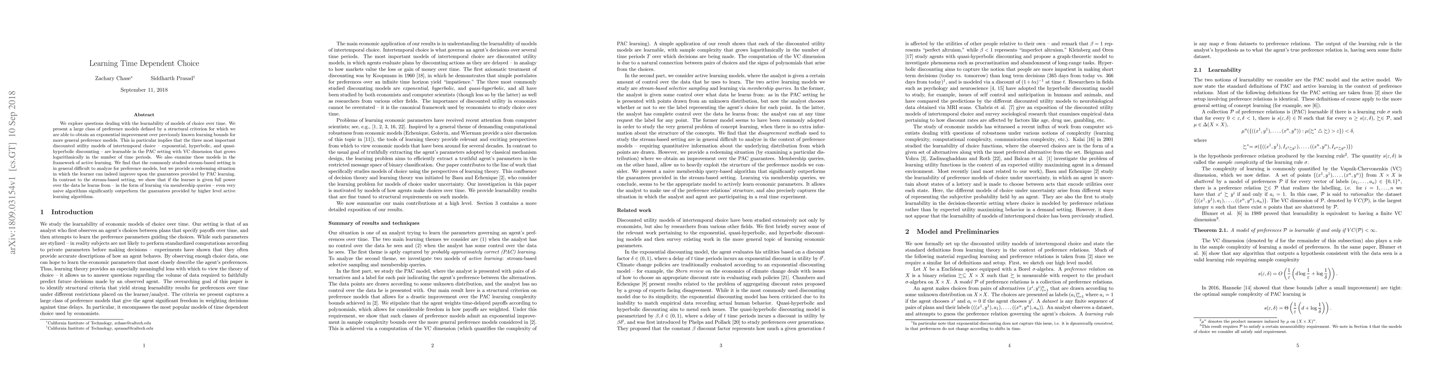 We explore questions dealing with the learnability of models of choice over time. We present a large class of preference models defined by a structural criterion for which we are able to obtain an exponential improvement over previously known learning bounds for more general preference models. This in particular implies that the three most important discounted utility models of intertemporal choice -- exponential, hyperbolic, and quasi-hyperbolic discounting -- are learnable in the PAC setting with VC dimension that grows logarithmically in the number of time periods. We also examine these models in the framework of active learning. We find that the commonly studied stream-based setting is in general difficult to analyze for preference models, but we provide a redeeming situation in which the learner can indeed improve upon the guarantees provided by PAC learning. In contrast to the stream-based setting, we show that if the learner is given full power over the data he learns from -- in the form of learning via membership queries -- even very naive algorithms significantly outperform the guarantees provided by higher level active learning algorithms.