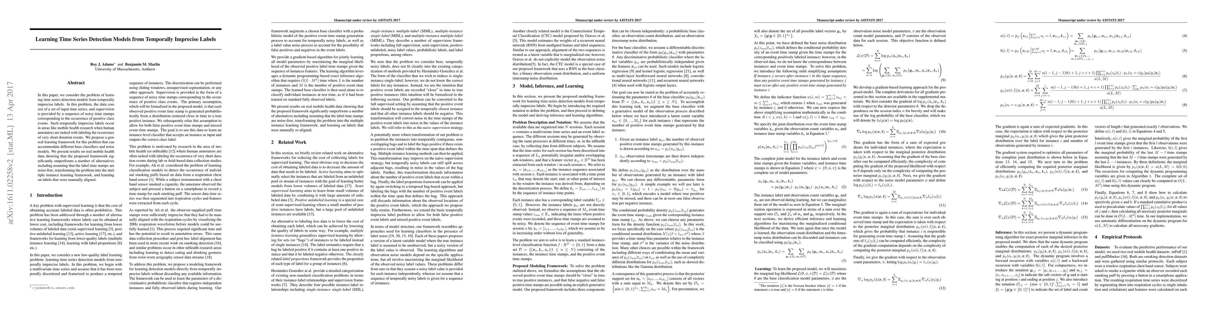 This paper introduces a framework for learning time series detection models using temporally imprecise labels, which are noisy timestamps indicating event occurrences. The proposed method outperforms alternatives by effectively handling label noise and is demonstrated on real mobile health data.