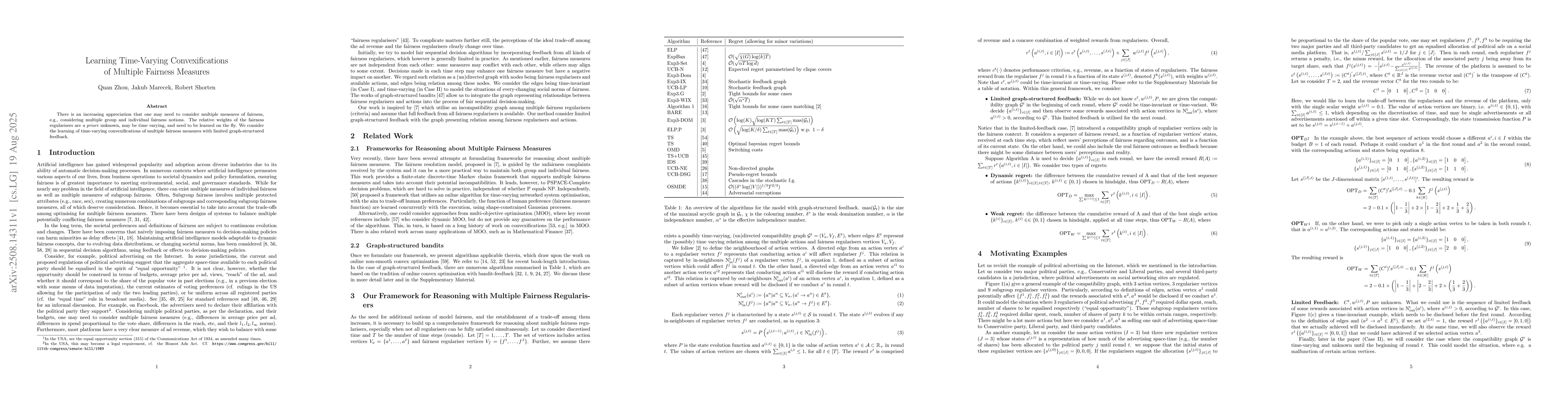 There is an increasing appreciation that one may need to consider multiple measures of fairness, e.g., considering multiple group and individual fairness notions. The relative weights of the fairness regularisers are a priori unknown, may be time varying, and need to be learned on the fly. We consider the learning of time-varying convexifications of multiple fairness measures with limited graph-structured feedback.