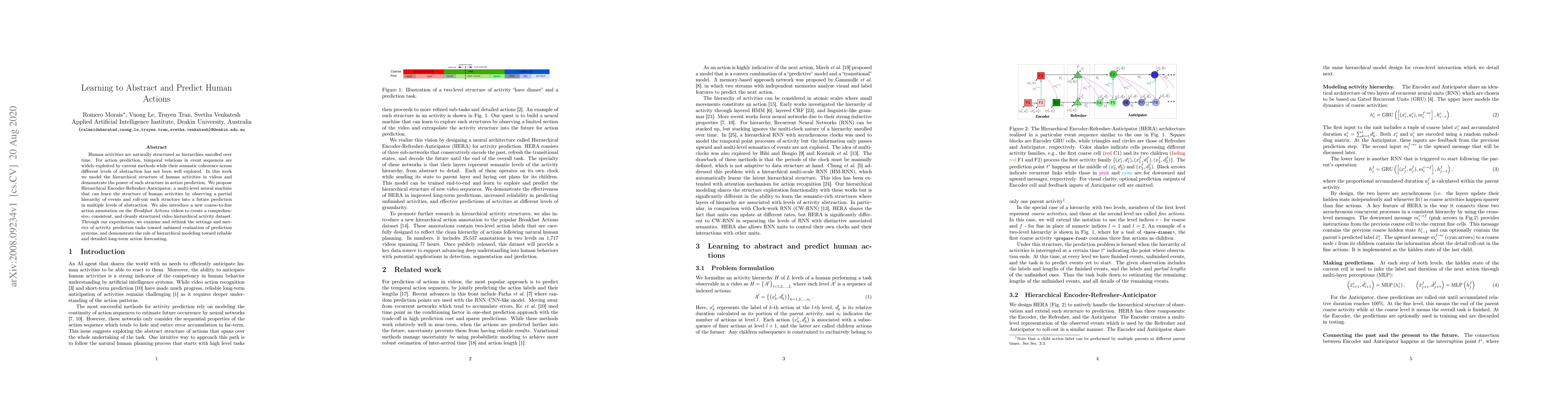 This research introduces Hierarchical Encoder-Refresher-Anticipator, a neural network model that learns hierarchical structures of human activities in videos for accurate long-term action prediction. It also presents a new coarse-to-fine action dataset called Breakfast Actions, promoting unbiased evaluation and reliable forecasting in activity prediction tasks.