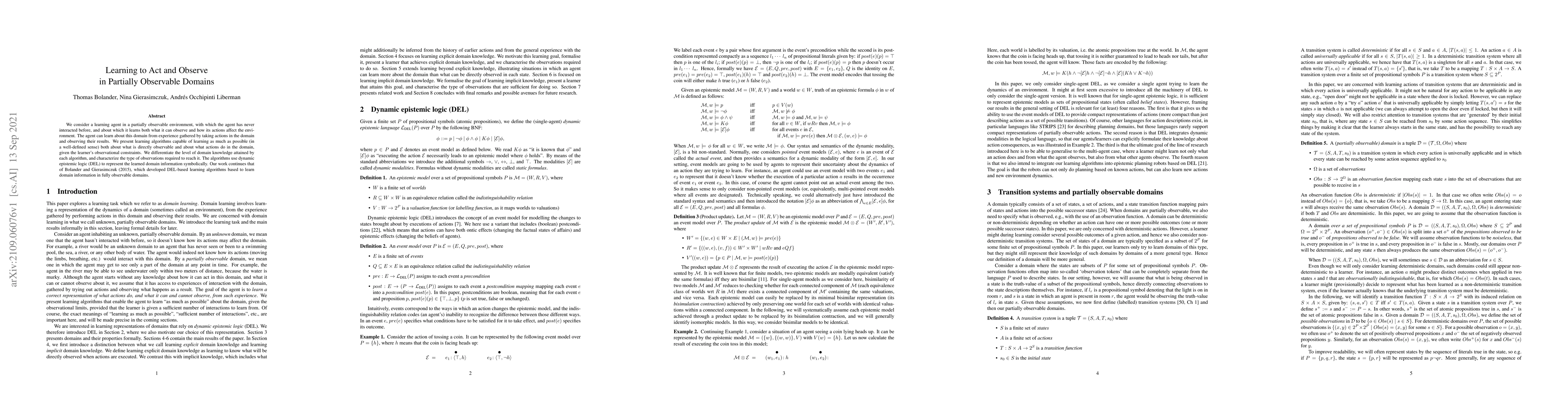 This research paper presents learning algorithms that can learn both what is directly observable and how actions affect an environment in a partially observable domain. The algorithms use dynamic epistemic logic to represent the learned domain information symbolically.