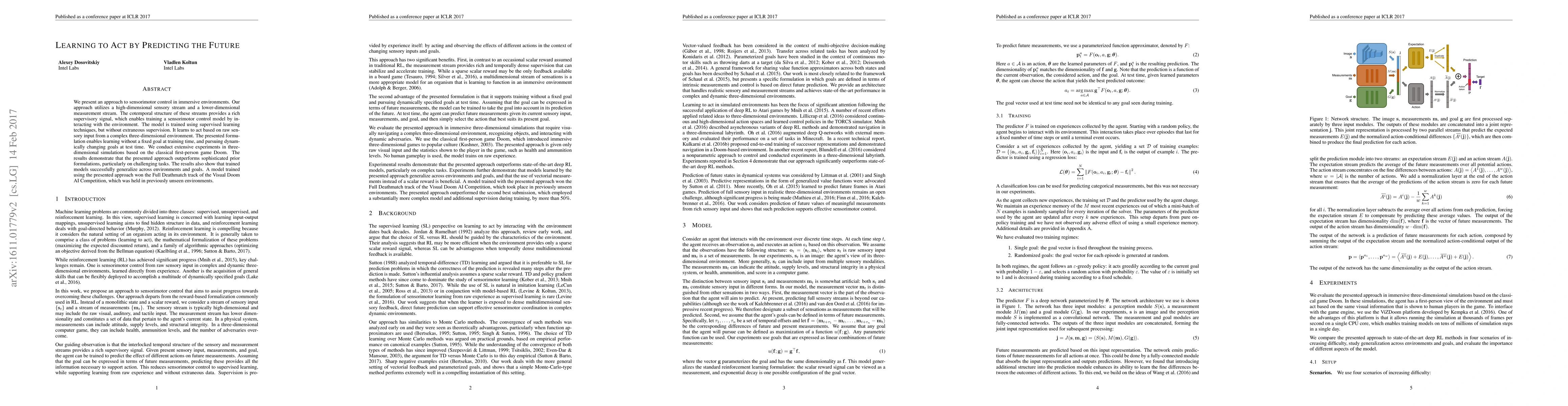 We present an approach to sensorimotor control in immersive environments. Our approach utilizes a high-dimensional sensory stream and a lower-dimensional measurement stream. The cotemporal structure of these streams provides a rich supervisory signal, which enables training a sensorimotor control model by interacting with the environment. The model is trained using supervised learning techniques, but without extraneous supervision. It learns to act based on raw sensory input from a complex three-dimensional environment. The presented formulation enables learning without a fixed goal at training time, and pursuing dynamically changing goals at test time. We conduct extensive experiments in three-dimensional simulations based on the classical first-person game Doom. The results demonstrate that the presented approach outperforms sophisticated prior formulations, particularly on challenging tasks. The results also show that trained models successfully generalize across environments and goals. A model trained using the presented approach won the Full Deathmatch track of the Visual Doom AI Competition, which was held in previously unseen environments.