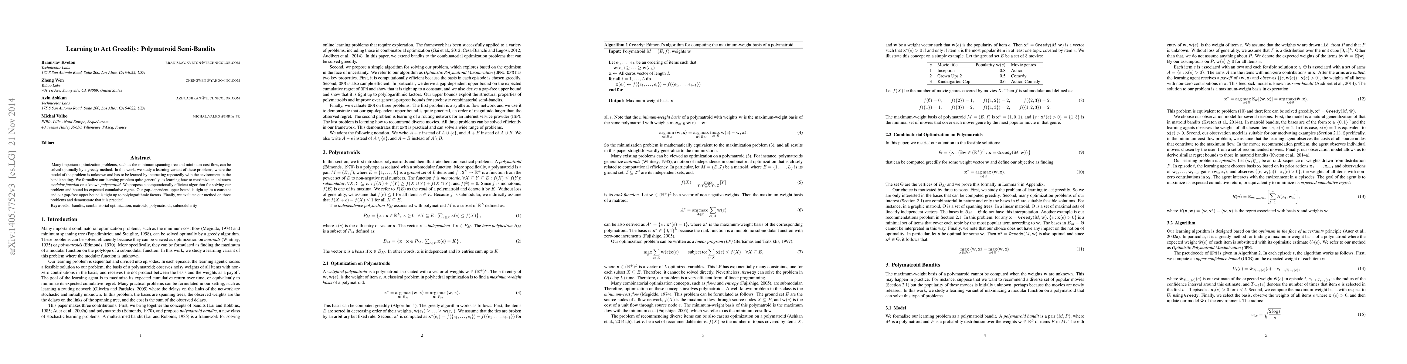 Many important optimization problems, such as the minimum spanning tree and minimum-cost flow, can be solved optimally by a greedy method. In this work, we study a learning variant of these problems, where the model of the problem is unknown and has to be learned by interacting repeatedly with the environment in the bandit setting. We formalize our learning problem quite generally, as learning how to maximize an unknown modular function on a known polymatroid. We propose a computationally efficient algorithm for solving our problem and bound its expected cumulative regret. Our gap-dependent upper bound is tight up to a constant and our gap-free upper bound is tight up to polylogarithmic factors. Finally, we evaluate our method on three problems and demonstrate that it is practical.