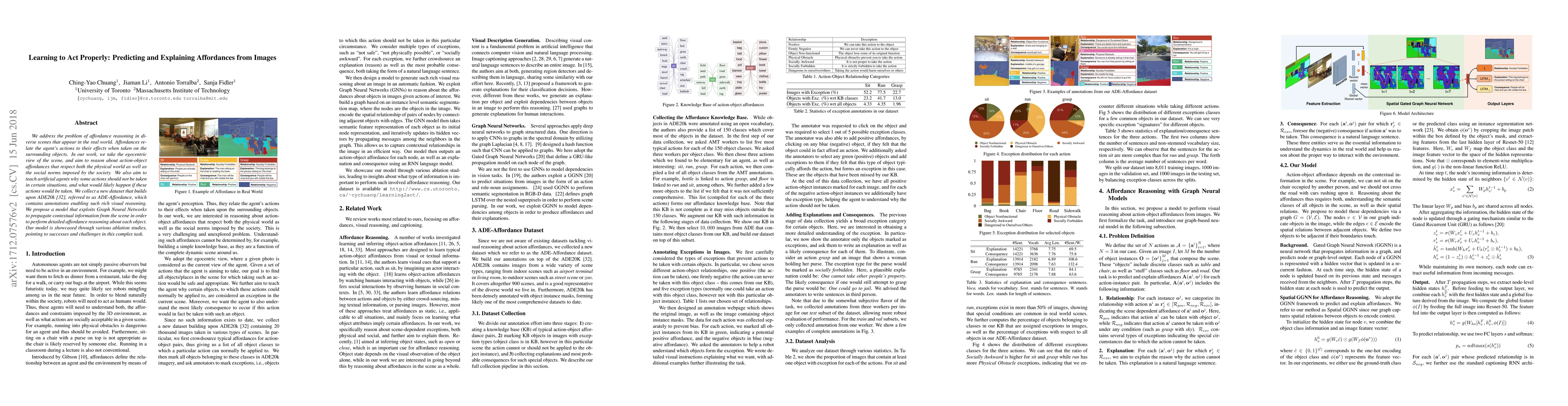 We address the problem of affordance reasoning in diverse scenes that appear in the real world. Affordances relate the agent's actions to their effects when taken on the surrounding objects. In our work, we take the egocentric view of the scene, and aim to reason about action-object affordances that respect both the physical world as well as the social norms imposed by the society. We also aim to teach artificial agents why some actions should not be taken in certain situations, and what would likely happen if these actions would be taken. We collect a new dataset that builds upon ADE20k, referred to as ADE-Affordance, which contains annotations enabling such rich visual reasoning. We propose a model that exploits Graph Neural Networks to propagate contextual information from the scene in order to perform detailed affordance reasoning about each object. Our model is showcased through various ablation studies, pointing to successes and challenges in this complex task.
