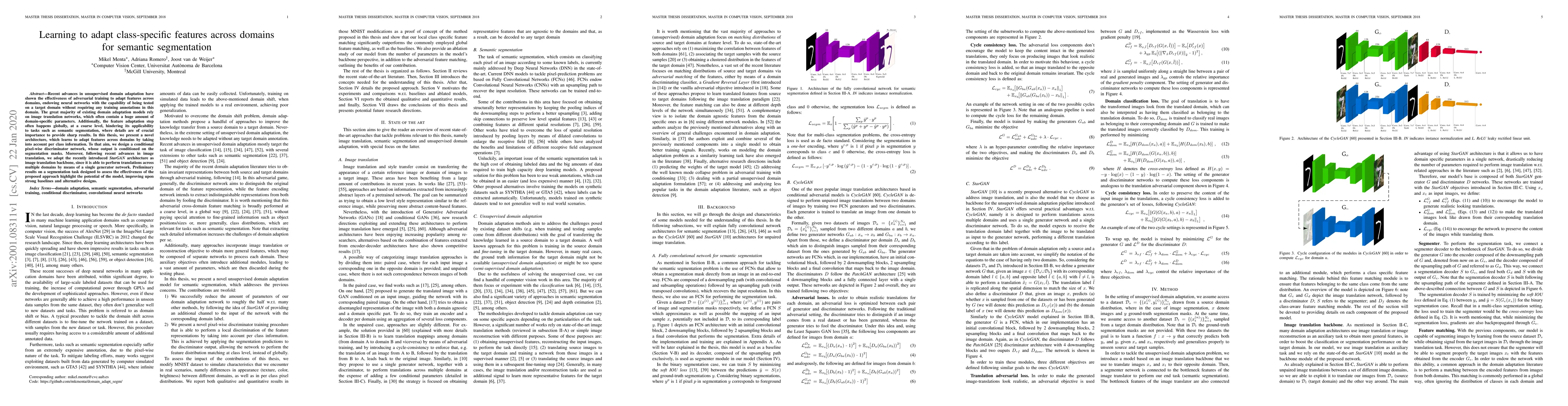 Recent advances in unsupervised domain adaptation have shown the effectiveness of adversarial training to adapt features across domains, endowing neural networks with the capability of being tested on a target domain without requiring any training annotations in this domain. The great majority of existing domain adaptation models rely on image translation networks, which often contain a huge amount of domain-specific parameters. Additionally, the feature adaptation step often happens globally, at a coarse level, hindering its applicability to tasks such as semantic segmentation, where details are of crucial importance to provide sharp results. In this thesis, we present a novel architecture, which learns to adapt features across domains by taking into account per class information. To that aim, we design a conditional pixel-wise discriminator network, whose output is conditioned on the segmentation masks. Moreover, following recent advances in image translation, we adopt the recently introduced StarGAN architecture as image translation backbone, since it is able to perform translations across multiple domains by means of a single generator network. Preliminary results on a segmentation task designed to assess the effectiveness of the proposed approach highlight the potential of the model, improving upon strong baselines and alternative designs.