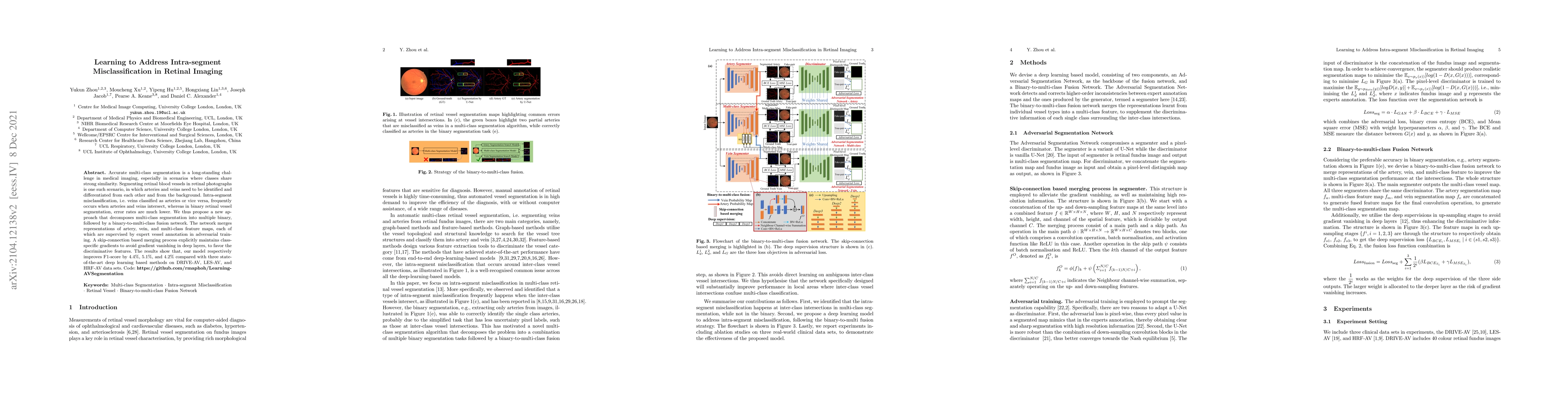 This paper proposes a novel deep learning approach to improve multi-class segmentation of retinal blood vessels, specifically addressing intra-segment misclassification between arteries and veins. The method uses a binary-to-multi-class fusion network with skip connections to enhance discriminative features, achieving better F1-scores compared to state-of-the-art methods.