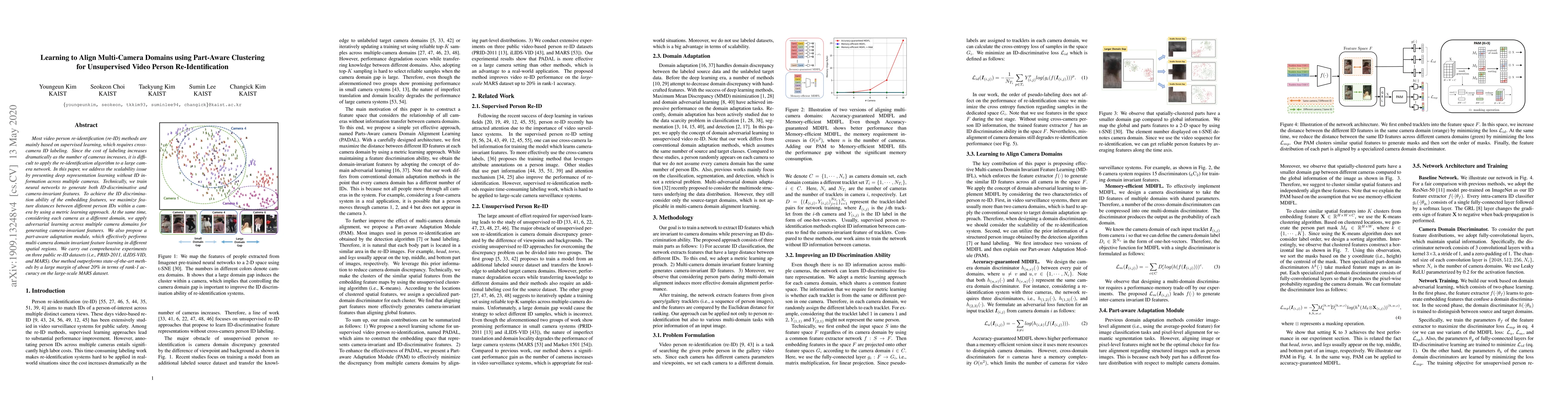 A new method for video person re-identification that can handle multiple cameras without requiring labeled data is presented, achieving a 20% improvement over state-of-the-art methods on large-scale datasets.