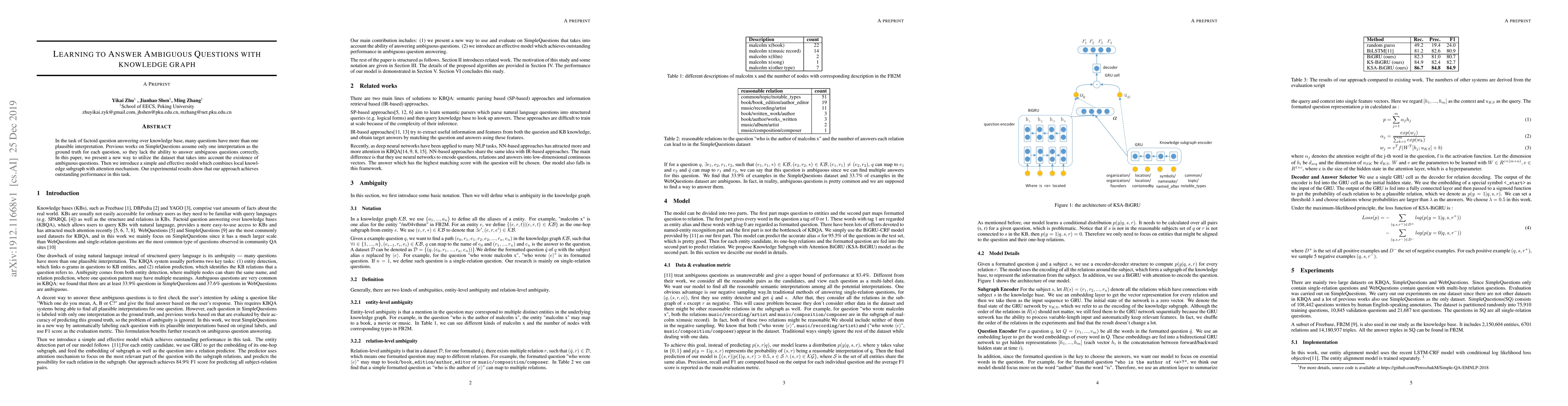 In the task of factoid question answering over knowledge base, many questions have more than one plausible interpretation. Previous works on SimpleQuestions assume only one interpretation as the ground truth for each question, so they lack the ability to answer ambiguous questions correctly. In this paper, we present a new way to utilize the dataset that takes into account the existence of ambiguous questions. Then we introduce a simple and effective model which combines local knowledge subgraph with attention mechanism. Our experimental results show that our approach achieves outstanding performance in this task.