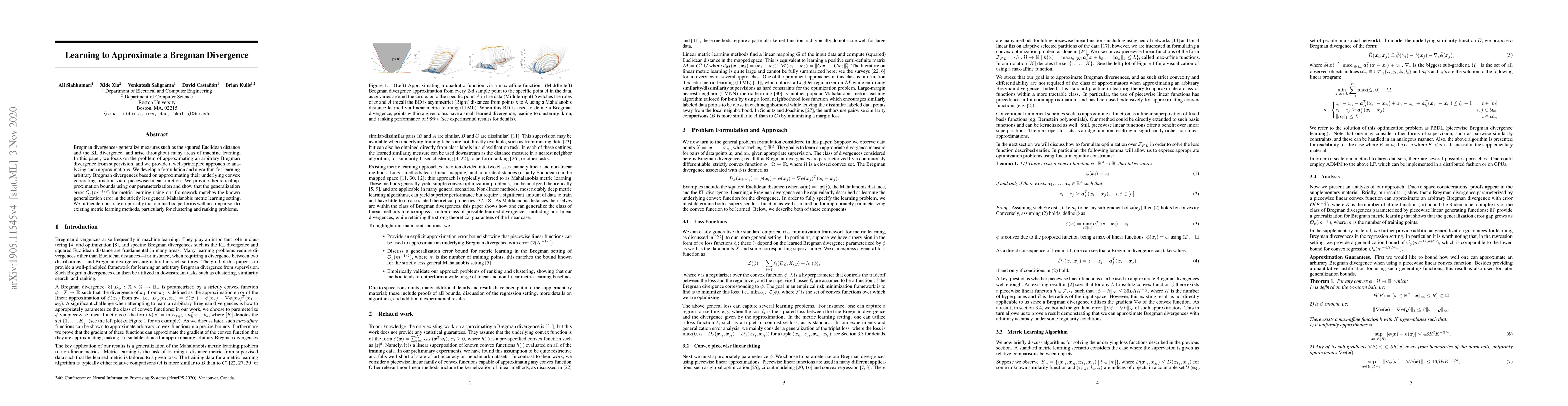 This paper presents a method for approximating arbitrary Bregman divergences using supervised learning, focusing on a piecewise linear approximation of their convex generating functions. The authors provide theoretical bounds and demonstrate through experiments that their approach performs well for clustering and ranking tasks, matching the generalization error of Mahalanobis metric learning.