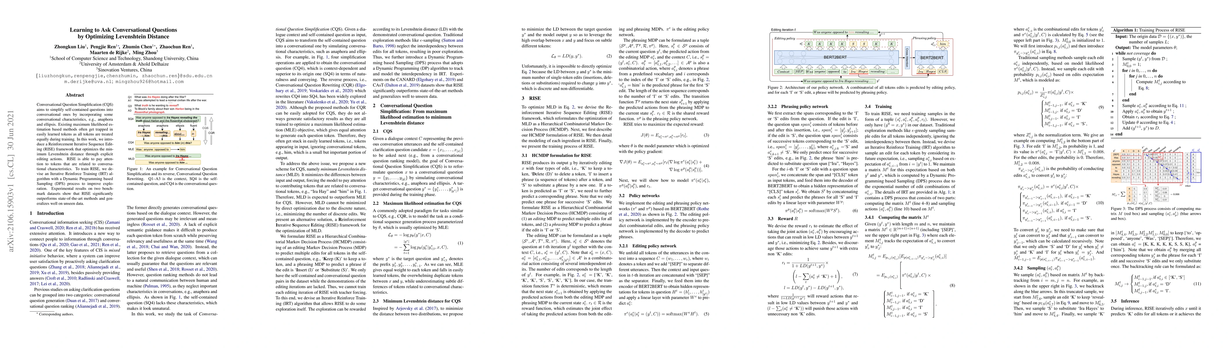 RISE significantly improves question simplification by paying attention to tokens related to conversational characteristics and generalizing well on unseen data.