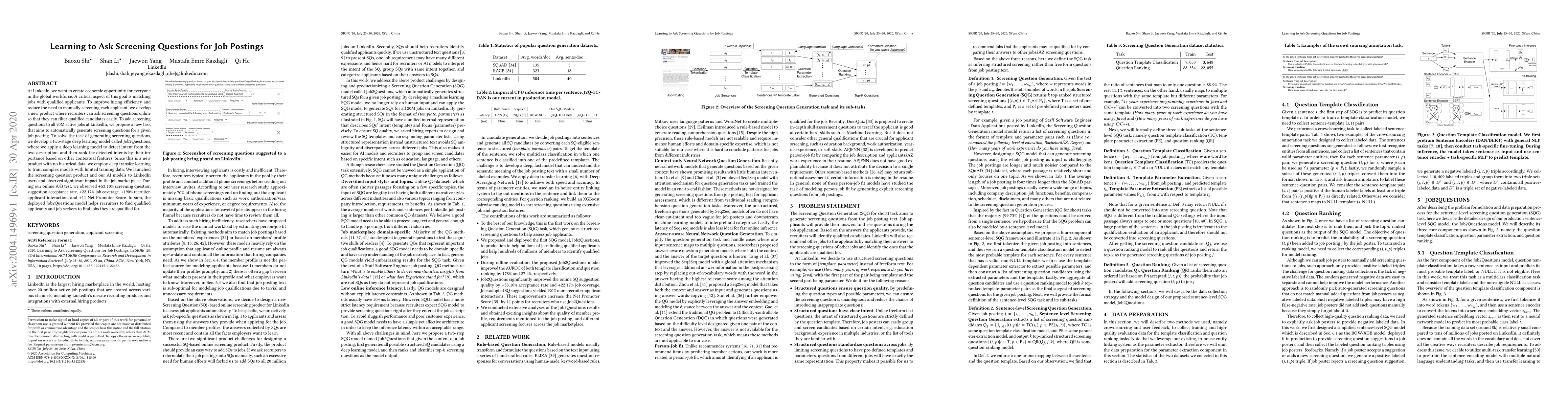 A new AI model called Job2Questions automatically generates screening questions for job postings, leading to a 53.10% increase in screening question acceptance rate and improved hiring efficiency.