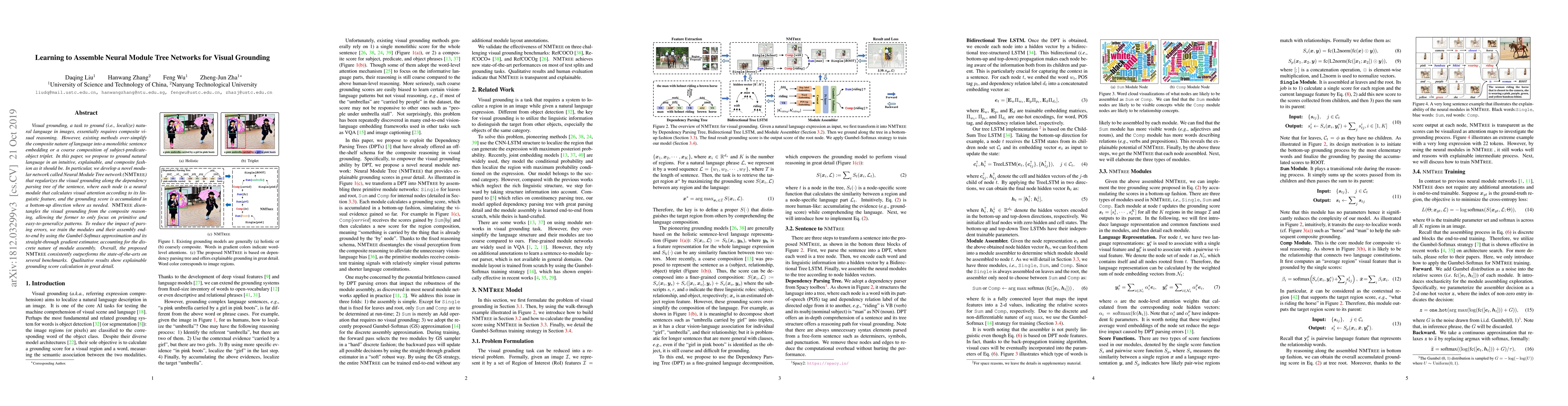 This paper proposes a Neural Module Tree network (NMTree) to ground natural language in images by decomposing visual reasoning into modular components aligned with sentence dependency parsing. The NMTree outperforms existing methods by providing explainable and detailed grounding scores.