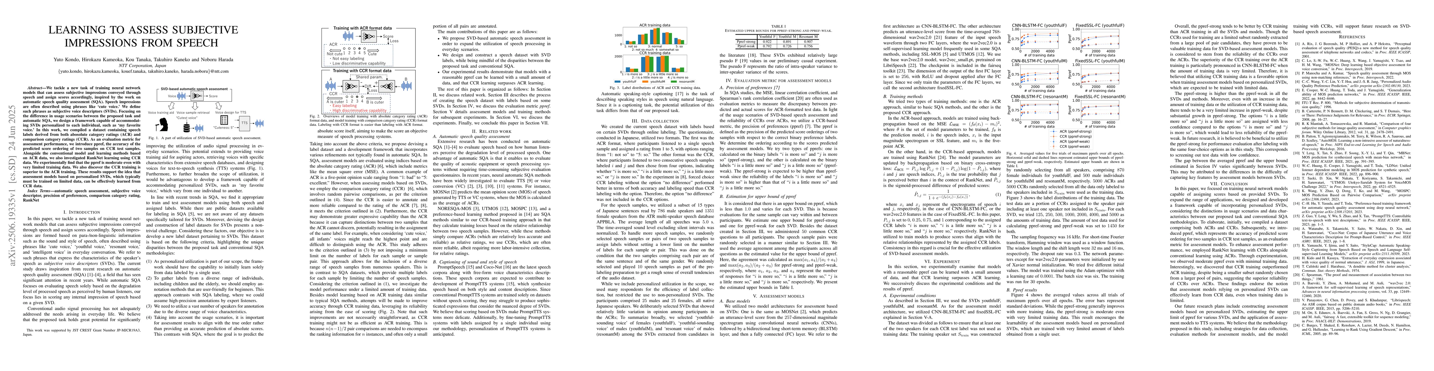 We tackle a new task of training neural network models that can assess subjective impressions conveyed through speech and assign scores accordingly, inspired by the work on automatic speech quality assessment (SQA). Speech impressions are often described using phrases like `cute voice.' We define such phrases as subjective voice descriptors (SVDs). Focusing on the difference in usage scenarios between the proposed task and automatic SQA, we design a framework capable of accommodating SVDs personalized to each individual, such as `my favorite voice.' In this work, we compiled a dataset containing speech labels derived from both abosolute category ratings (ACR) and comparison category ratings (CCR). As an evaluation metric for assessment performance, we introduce ppref, the accuracy of the predicted score ordering of two samples on CCR test samples. Alongside the conventional model and learning methods based on ACR data, we also investigated RankNet learning using CCR data. We experimentally find that the ppref is moderate even with very limited training data. We also discover the CCR training is superior to the ACR training. These results support the idea that assessment models based on personalized SVDs, which typically must be trained on limited data, can be effectively learned from CCR data.
