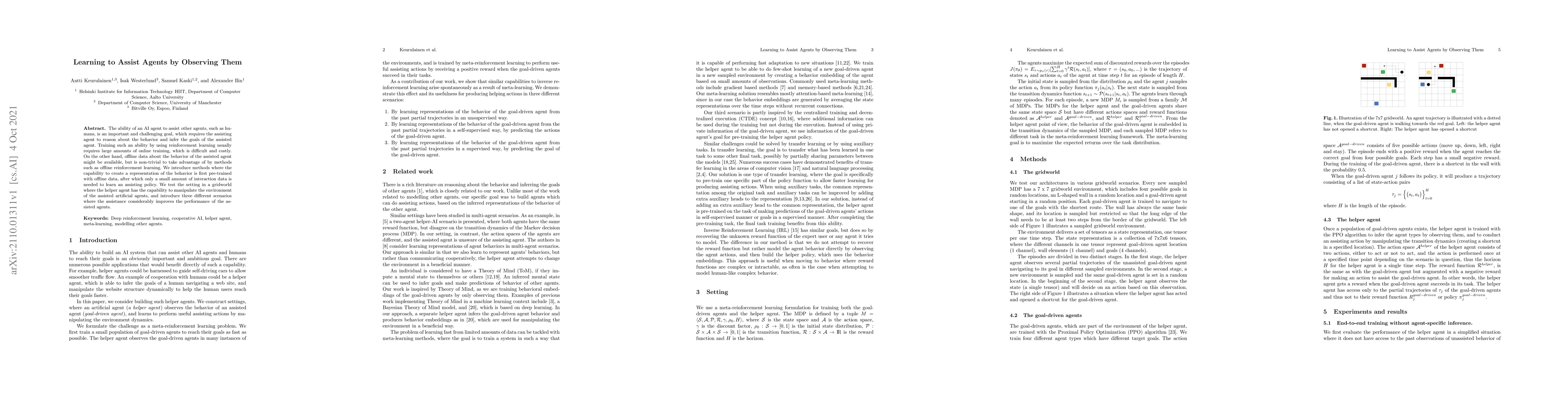 The ability of an AI agent to assist other agents, such as humans, is an important and challenging goal, which requires the assisting agent to reason about the behavior and infer the goals of the assisted agent. Training such an ability by using reinforcement learning usually requires large amounts of online training, which is difficult and costly. On the other hand, offline data about the behavior of the assisted agent might be available, but is non-trivial to take advantage of by methods such as offline reinforcement learning. We introduce methods where the capability to create a representation of the behavior is first pre-trained with offline data, after which only a small amount of interaction data is needed to learn an assisting policy. We test the setting in a gridworld where the helper agent has the capability to manipulate the environment of the assisted artificial agents, and introduce three different scenarios where the assistance considerably improves the performance of the assisted agents.