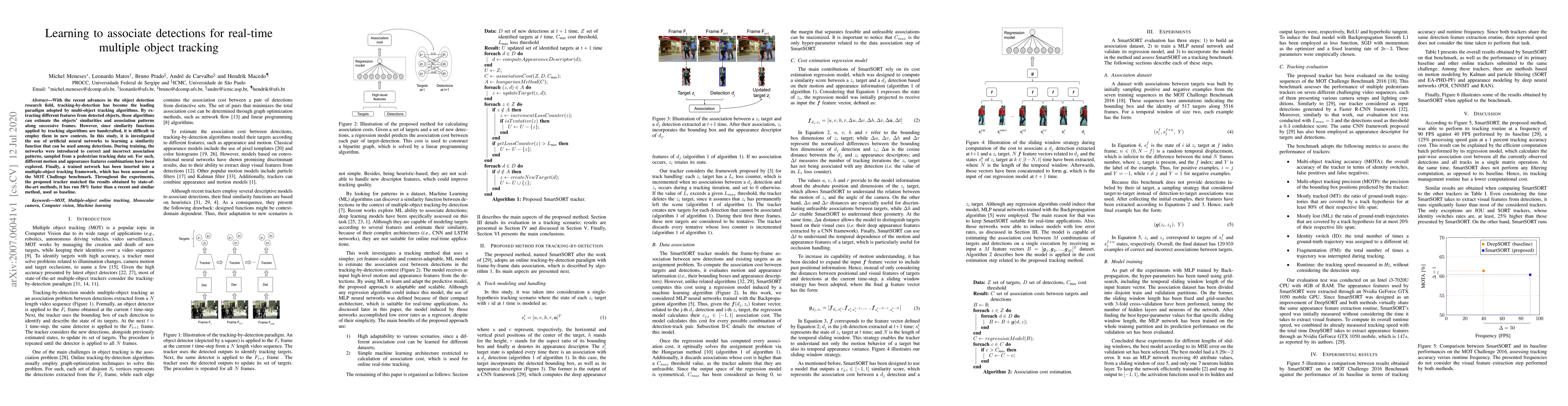 With the recent advances in the object detection research field, tracking-by-detection has become the leading paradigm adopted by multi-object tracking algorithms. By extracting different features from detected objects, those algorithms can estimate the objects' similarities and association patterns along successive frames. However, since similarity functions applied by tracking algorithms are handcrafted, it is difficult to employ them in new contexts. In this study, it is investigated the use of artificial neural networks to learning a similarity function that can be used among detections. During training, the networks were introduced to correct and incorrect association patterns, sampled from a pedestrian tracking data set. For such, different motion and appearance features combinations have been explored. Finally, a trained network has been inserted into a multiple-object tracking framework, which has been assessed on the MOT Challenge benchmark. Throughout the experiments, the proposed tracker matched the results obtained by state-of-the-art methods, it has run 58\% faster than a recent and similar method, used as baseline.