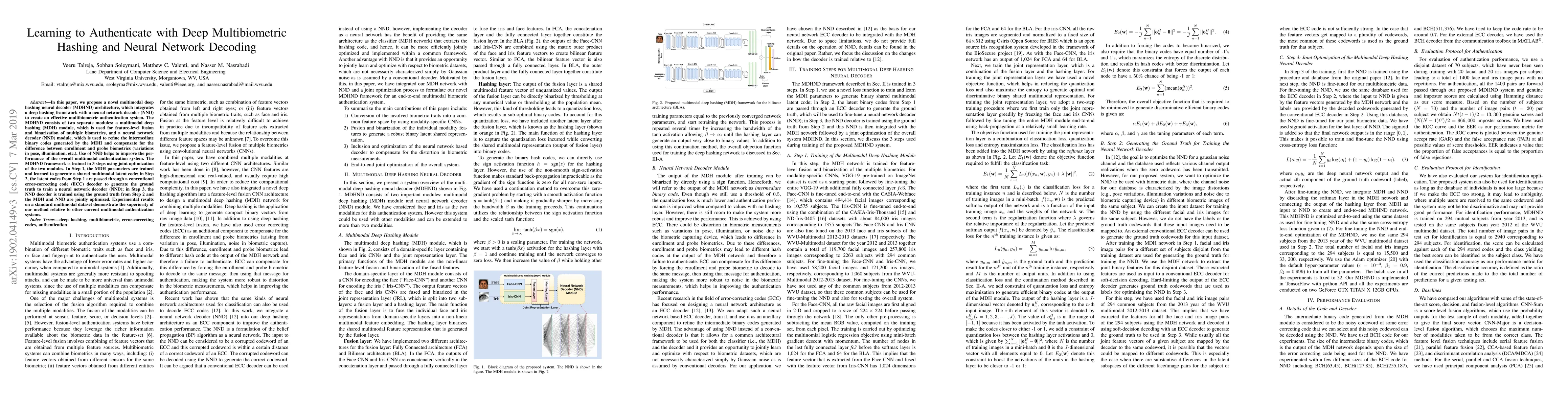 This paper introduces a novel MDHND architecture combining deep hashing and neural network decoding for multibiometric authentication, featuring a multimodal deep hashing module for feature fusion and a neural network decoder to refine binary codes and compensate for biometric variations. Experimental results show its superior performance over existing systems.