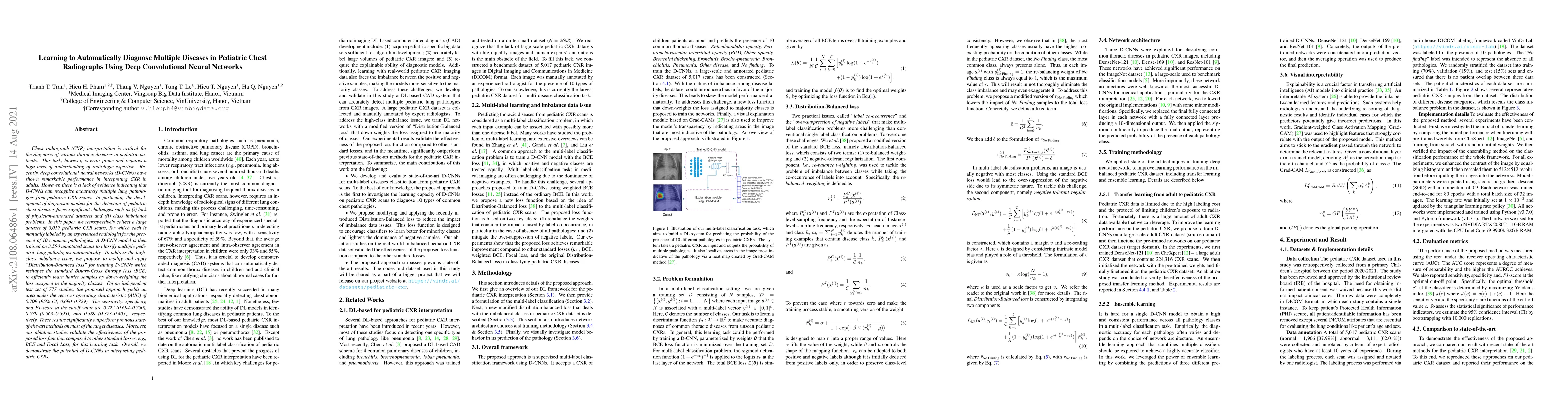 This paper develops a deep convolutional neural network (D-CNN) model to automatically diagnose multiple lung pathologies from pediatric chest radiographs, addressing challenges like dataset scarcity and class imbalance. The proposed "Distribution-Balanced loss" function improves model performance, achieving an AUC of 0.709 and outperforming previous methods.