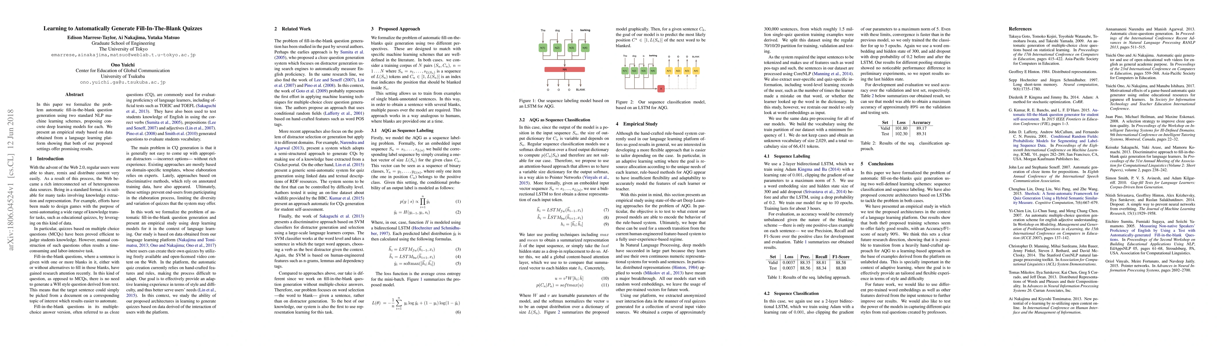 This paper proposes deep learning models for automatically generating fill-in-the-blank quizzes, demonstrating promising results through an empirical study on data from a language learning platform. The study shows the effectiveness of the proposed NLP machine learning schemes.