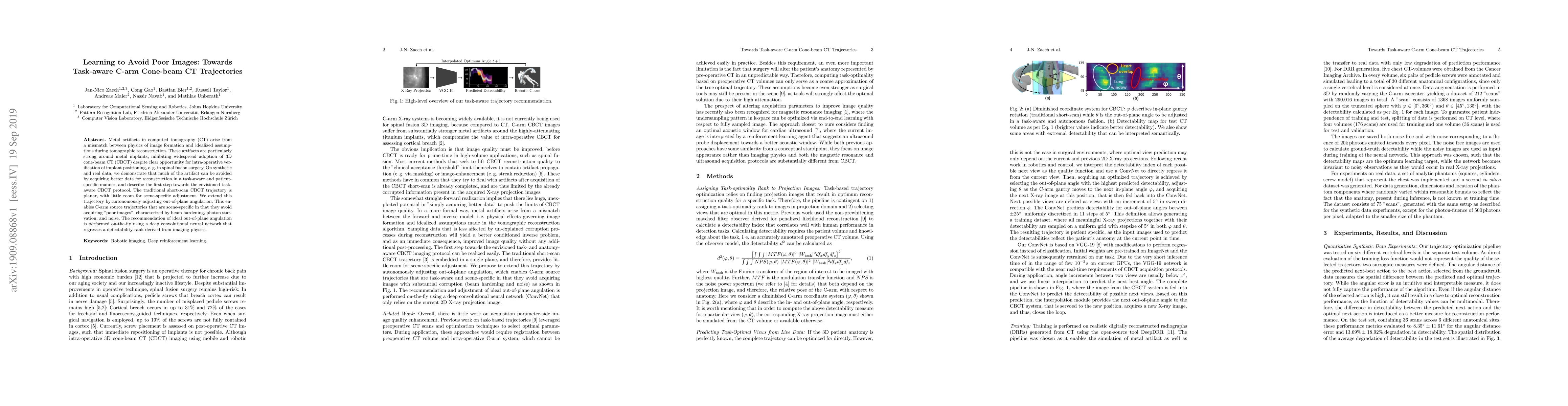 This paper proposes a method to reduce metal artifacts in 3D cone-beam CT (CBCT) by adjusting C-arm trajectories to avoid "poor images" that cause artifacts. It uses a deep convolutional neural network to autonomously recommend optimal out-of-plane angulations, improving task-specific image quality for applications like spinal fusion surgery.
