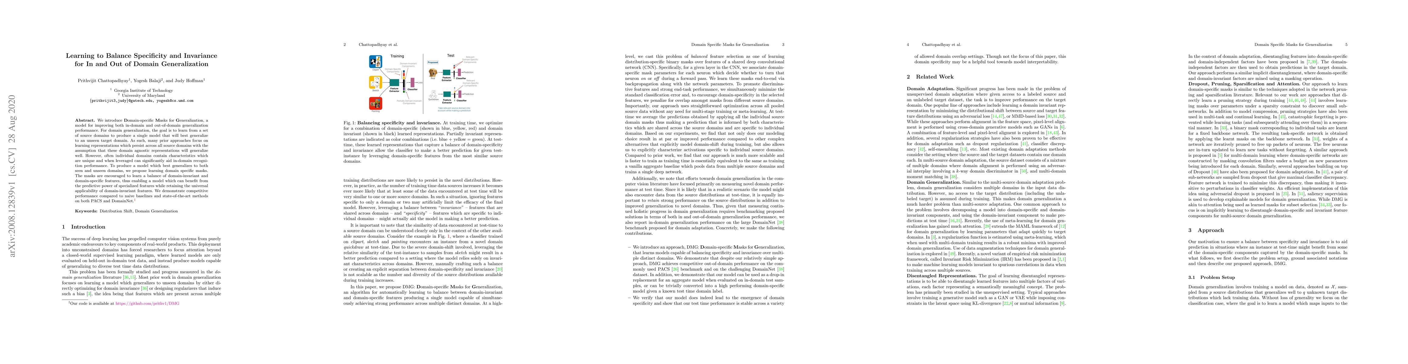 We introduce Domain-specific Masks for Generalization, a model for improving both in-domain and out-of-domain generalization performance. For domain generalization, the goal is to learn from a set of source domains to produce a single model that will best generalize to an unseen target domain. As such, many prior approaches focus on learning representations which persist across all source domains with the assumption that these domain agnostic representations will generalize well. However, often individual domains contain characteristics which are unique and when leveraged can significantly aid in-domain recognition performance. To produce a model which best generalizes to both seen and unseen domains, we propose learning domain specific masks. The masks are encouraged to learn a balance of domain-invariant and domain-specific features, thus enabling a model which can benefit from the predictive power of specialized features while retaining the universal applicability of domain-invariant features. We demonstrate competitive performance compared to naive baselines and state-of-the-art methods on both PACS and DomainNet.