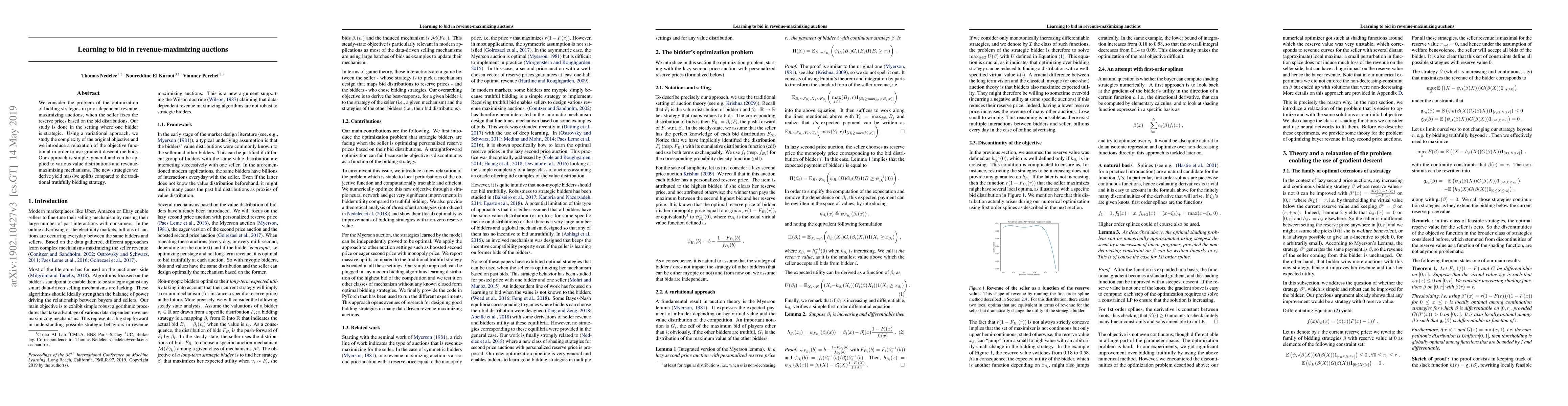 This paper optimizes bidding strategies in revenue-maximizing auctions using a variational approach and gradient descent methods, yielding significant improvements over traditional truthful bidding strategies. The proposed method is general and applicable to various value distributions and auction mechanisms.