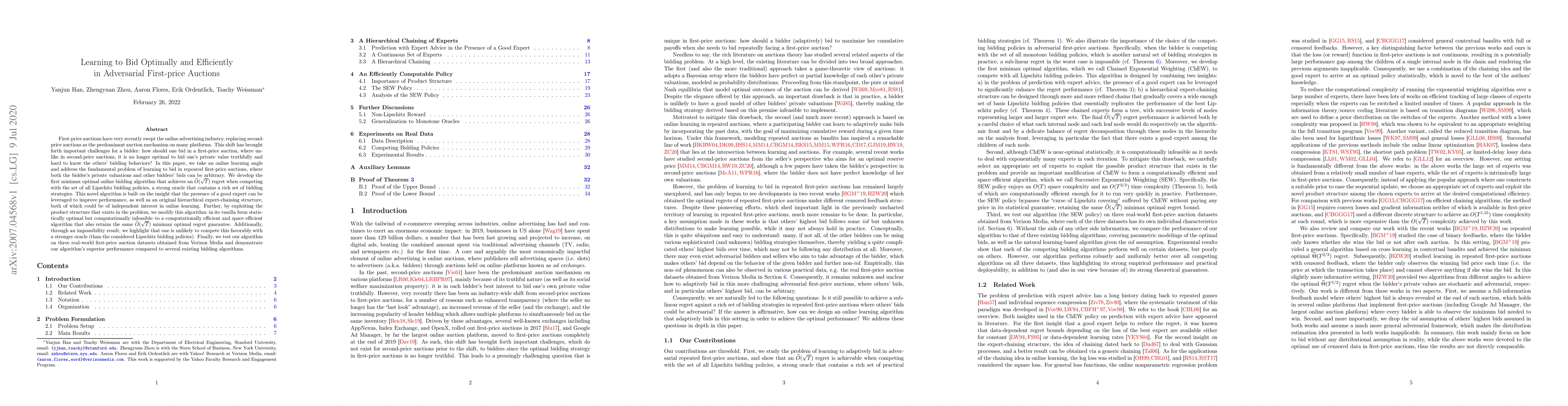 This paper develops a minimax optimal online bidding algorithm for first-price auctions, achieving $\widetilde{O}(\sqrt{T})$ regret. The algorithm leverages expert insights and a hierarchical expert-chaining structure, and is modified for computational efficiency while maintaining optimal regret guarantees.