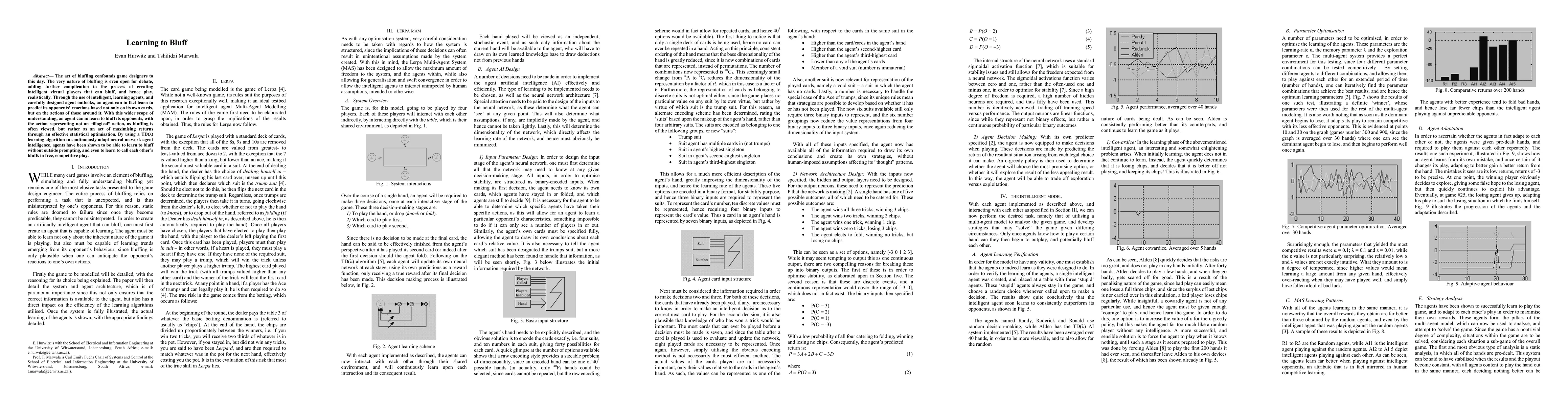 The act of bluffing confounds game designers to this day. The very nature of bluffing is even open for debate, adding further complication to the process of creating intelligent virtual players that can bluff, and hence play, realistically. Through the use of intelligent, learning agents, and carefully designed agent outlooks, an agent can in fact learn to predict its opponents reactions based not only on its own cards, but on the actions of those around it. With this wider scope of understanding, an agent can in learn to bluff its opponents, with the action representing not an illogical action, as bluffing is often viewed, but rather as an act of maximising returns through an effective statistical optimisation. By using a tee dee lambda learning algorithm to continuously adapt neural network agent intelligence, agents have been shown to be able to learn to bluff without outside prompting, and even to learn to call each others bluffs in free, competitive play.