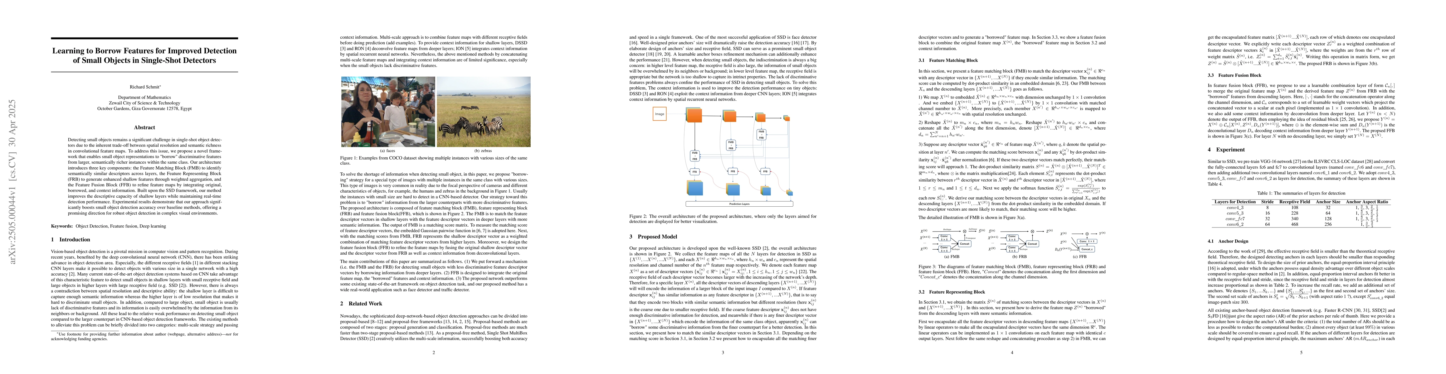 This paper proposes a framework to enhance small object detection in single-shot detectors by enabling small objects to "borrow" features from larger instances within the same class. The method includes the Feature Matching Block, Feature Representing Block, and Feature Fusion Block to improve feature representation and detection accuracy, achieving better results than baseline methods.