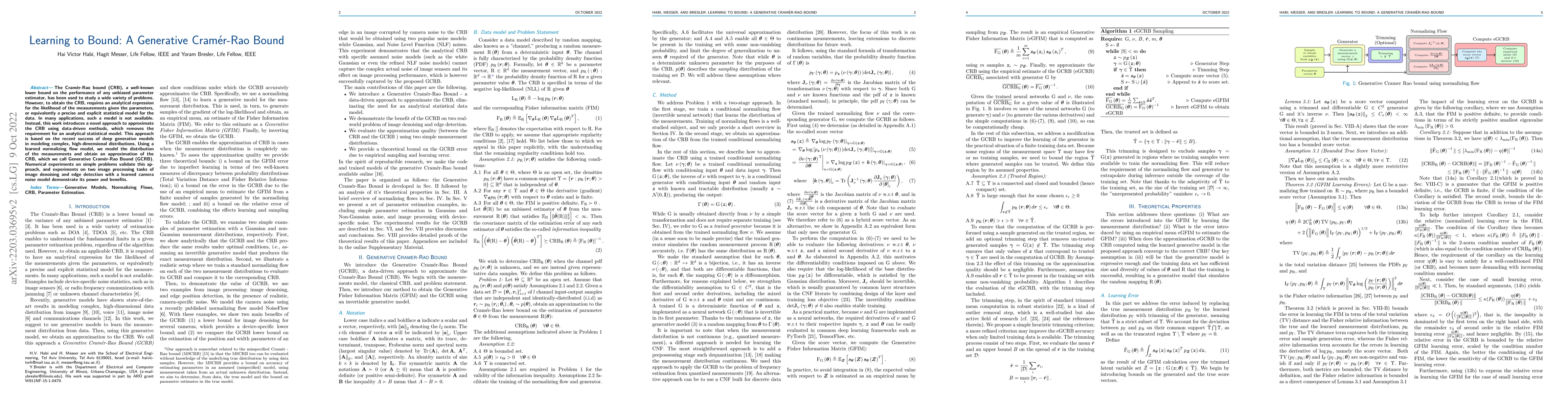 This paper introduces a data-driven method to approximate the Cramér-Rao bound (CRB) using generative models, eliminating the need for an analytical statistical model. The proposed Generative Cramér-Rao Bound (GCRB) leverages learned normalizing flows to model measurement distributions and demonstrates effectiveness in image processing tasks like denoising and edge detection.
