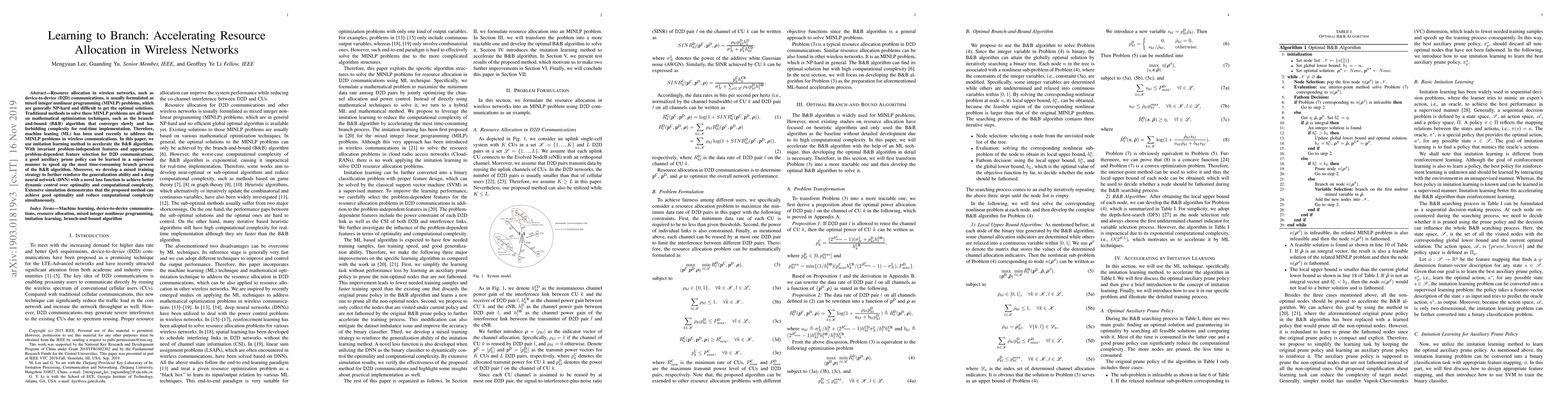 This paper proposes an imitation learning method to accelerate the branch-and-bound algorithm for solving mixed integer nonlinear programming problems in wireless networks, specifically D2D communications. The approach uses a supervised learning technique to develop an efficient auxiliary prune policy, combined with a mixed training strategy and deep neural network to balance optimality and computational efficiency.