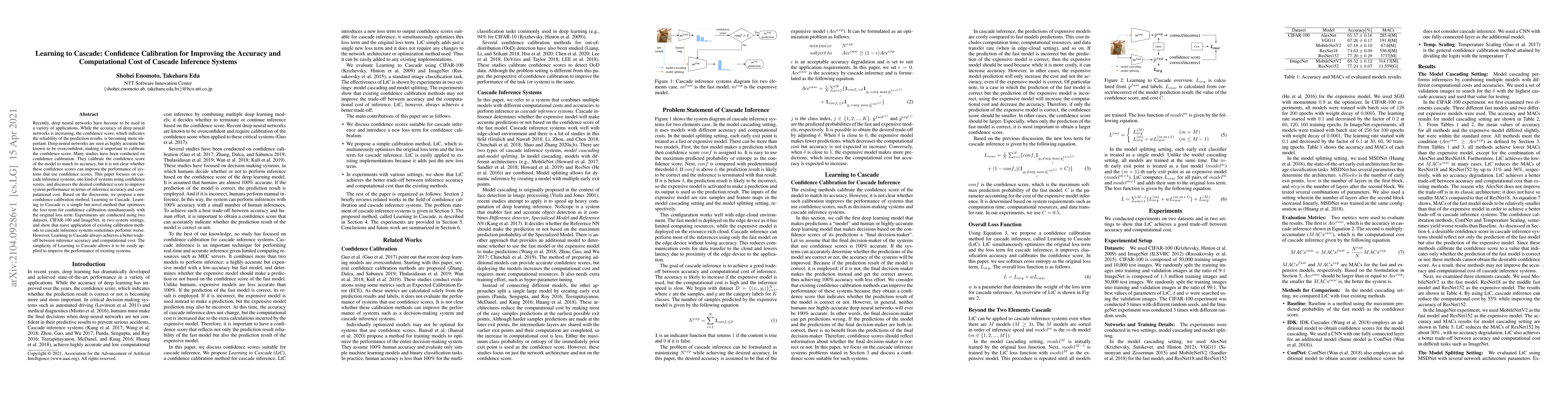 A new confidence calibration method called Learning to Cascade improves the accuracy and computational cost of cascade inference systems by optimizing both loss terms simultaneously, achieving a better trade-off between inference accuracy and cost.