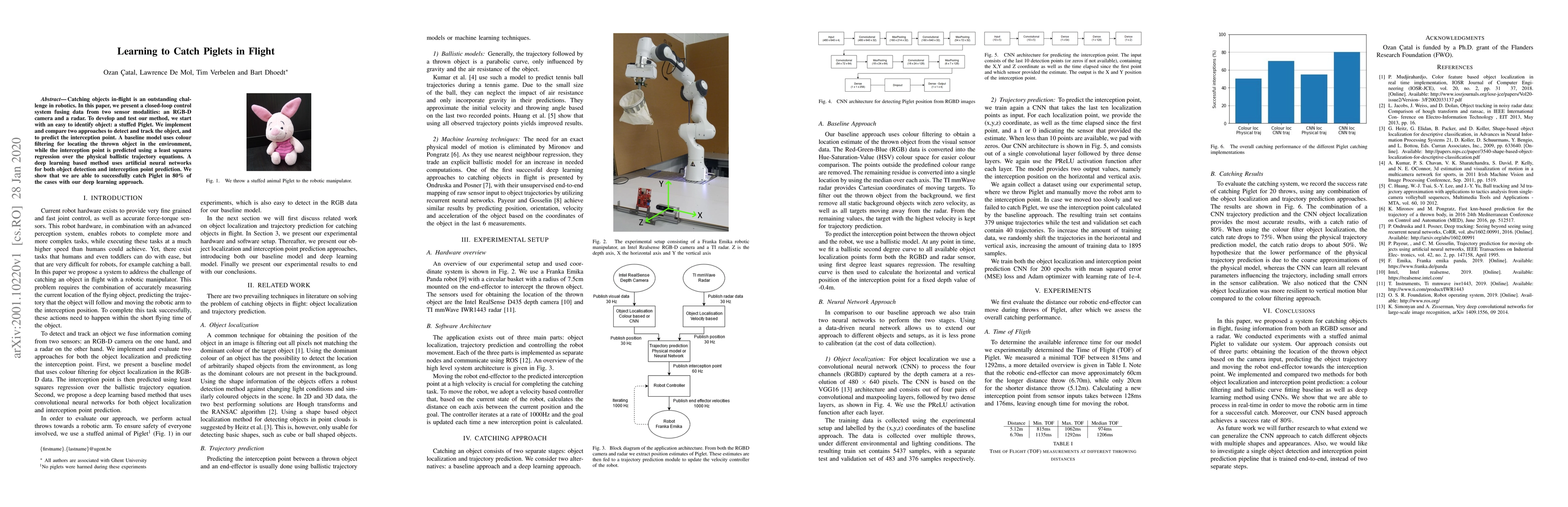 This paper develops a closed-loop control system using RGB-D camera and radar data to catch flying objects, starting with a stuffed Piglet. It compares a baseline model using color filtering and regression with a deep learning approach, achieving 80% success in catching the Piglet.