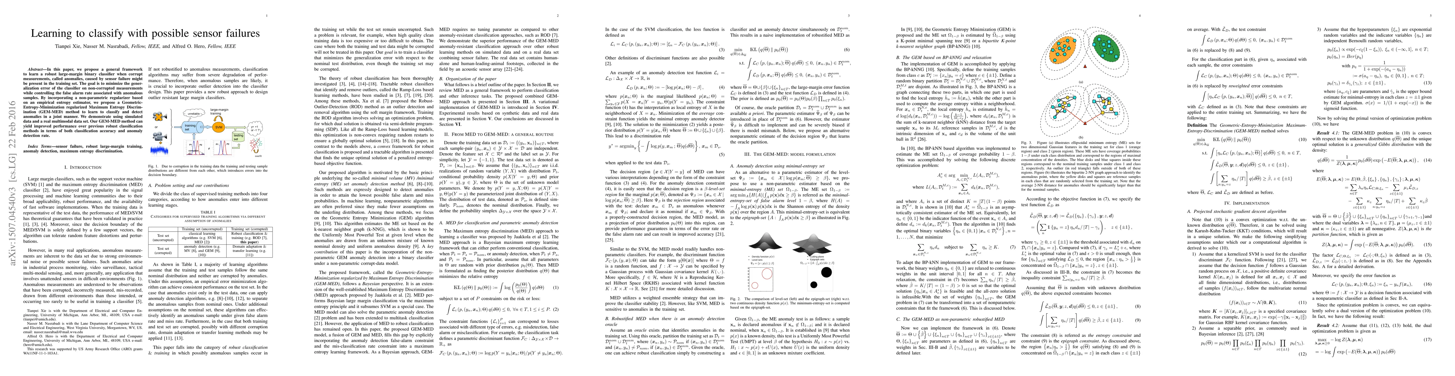 A new method called GEM-MED is proposed to learn robust binary classifiers that can handle corrupt measurements caused by sensor failures, improving performance over previous methods in classification accuracy and anomaly detection rate.