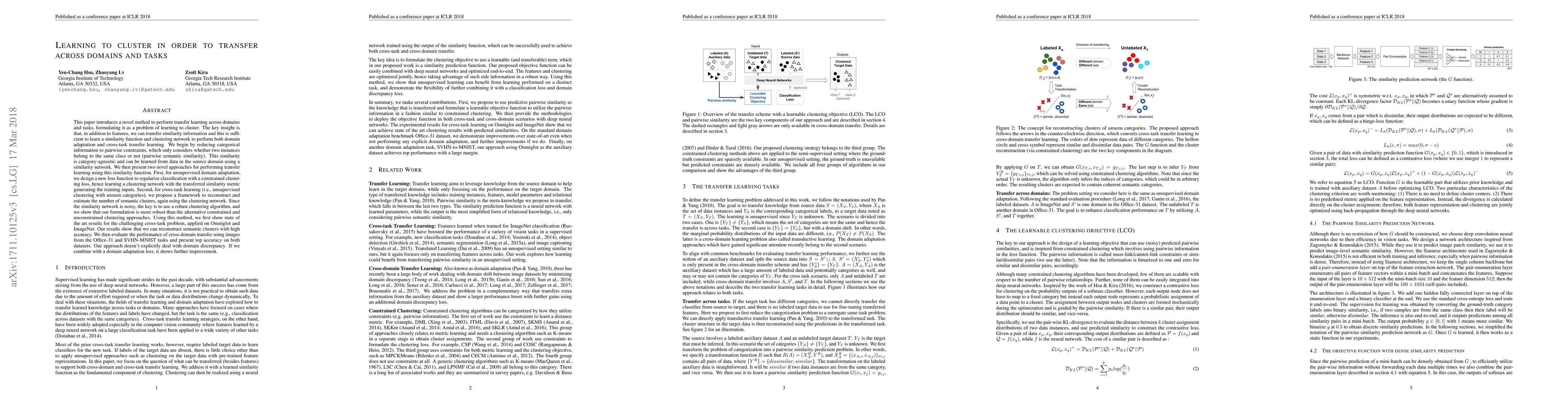 This paper introduces a novel method to perform transfer learning across domains and tasks, formulating it as a problem of learning to cluster. The key insight is that, in addition to features, we can transfer similarity information and this is sufficient to learn a similarity function and clustering network to perform both domain adaptation and cross-task transfer learning. We begin by reducing categorical information to pairwise constraints, which only considers whether two instances belong to the same class or not. This similarity is category-agnostic and can be learned from data in the source domain using a similarity network. We then present two novel approaches for performing transfer learning using this similarity function. First, for unsupervised domain adaptation, we design a new loss function to regularize classification with a constrained clustering loss, hence learning a clustering network with the transferred similarity metric generating the training inputs. Second, for cross-task learning (i.e., unsupervised clustering with unseen categories), we propose a framework to reconstruct and estimate the number of semantic clusters, again using the clustering network. Since the similarity network is noisy, the key is to use a robust clustering algorithm, and we show that our formulation is more robust than the alternative constrained and unconstrained clustering approaches. Using this method, we first show state of the art results for the challenging cross-task problem, applied on Omniglot and ImageNet. Our results show that we can reconstruct semantic clusters with high accuracy. We then evaluate the performance of cross-domain transfer using images from the Office-31 and SVHN-MNIST tasks and present top accuracy on both datasets. Our approach doesn't explicitly deal with domain discrepancy. If we combine with a domain adaptation loss, it shows further improvement.