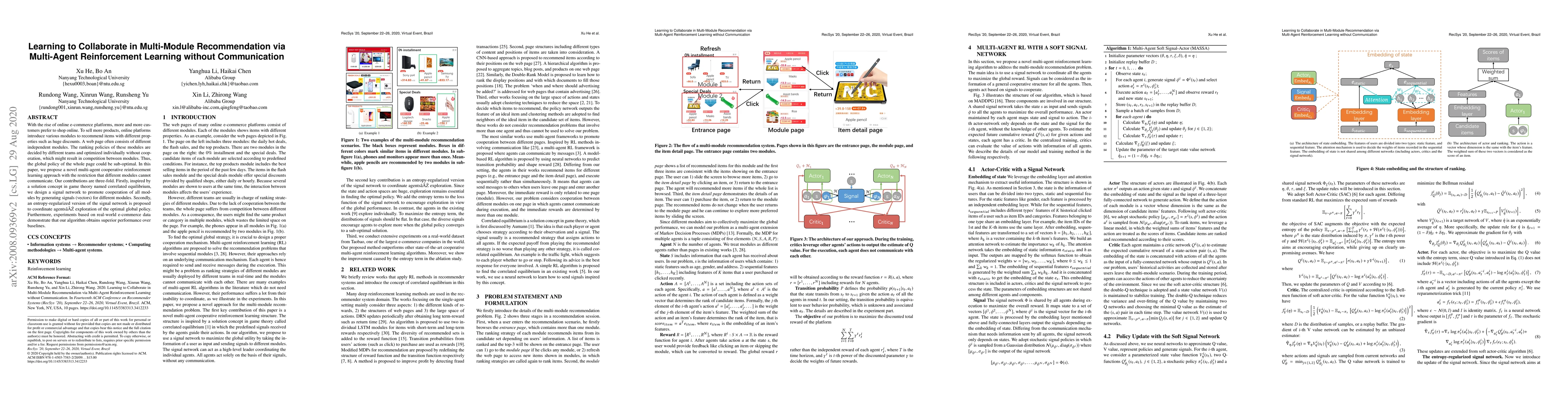 This paper proposes a multi-agent reinforcement learning method to collaboratively optimize recommendation modules on e-commerce platforms without direct communication. The approach uses a signal network inspired by correlated equilibrium to promote cooperation among modules, leading to improved performance over baselines in real-world data experiments.