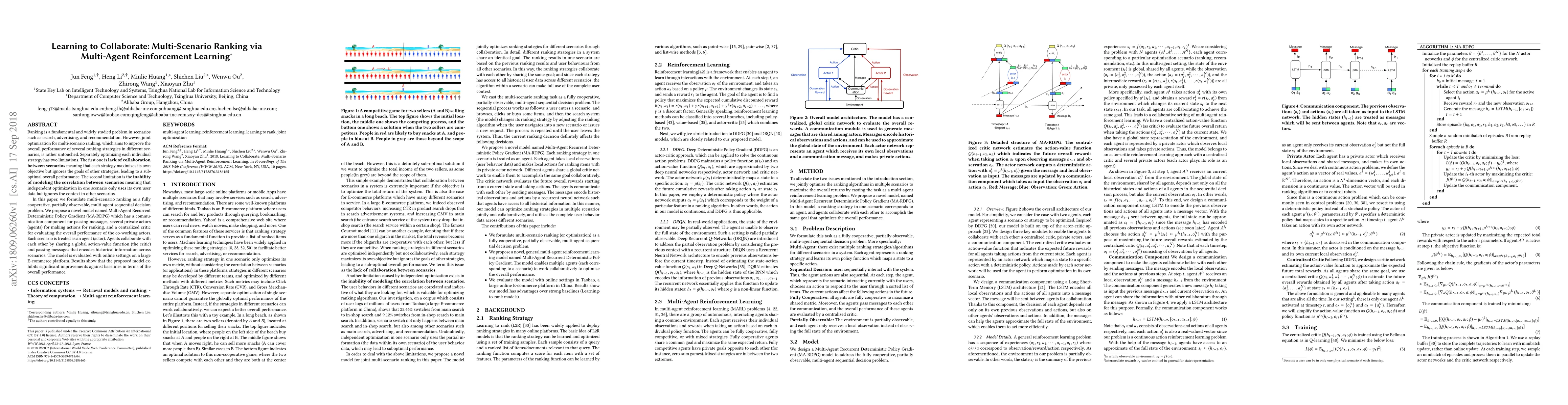 This paper proposes a novel Multi-Agent Recurrent Deterministic Policy Gradient (MA-RDPG) model to collaboratively optimize multi-scenario ranking, addressing the limitations of independent optimization by enabling agents to share information and improve overall performance. The model shows significant improvements over baselines in an online E-commerce setting.