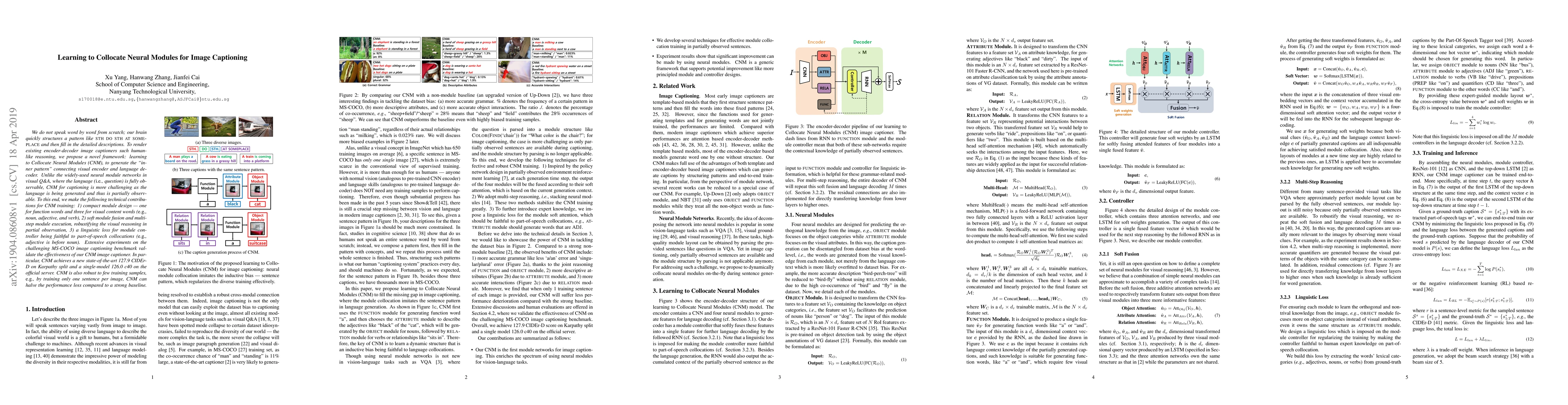 This paper proposes a novel framework called Collocate Neural Modules (CNM) to enhance image captioning systems by mimicking human-like reasoning. The CNM framework introduces compact neural modules for function and content words, enabling soft fusion and multi-step execution to handle partial language observations during generation. Experimental results show state-of-the-art performance on MS-COCO, with notable robustness to limited training data.