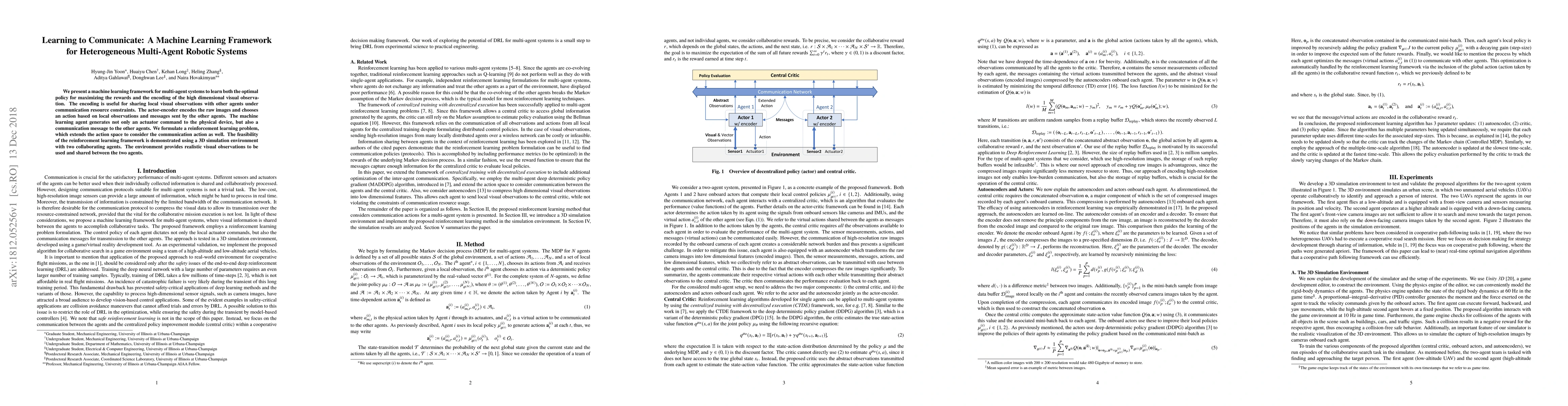We present a machine learning framework for multi-agent systems to learn both the optimal policy for maximizing the rewards and the encoding of the high dimensional visual observation. The encoding is useful for sharing local visual observations with other agents under communication resource constraints. The actor-encoder encodes the raw images and chooses an action based on local observations and messages sent by the other agents. The machine learning agent generates not only an actuator command to the physical device, but also a communication message to the other agents. We formulate a reinforcement learning problem, which extends the action space to consider the communication action as well. The feasibility of the reinforcement learning framework is demonstrated using a 3D simulation environment with two collaborating agents. The environment provides realistic visual observations to be used and shared between the two agents.