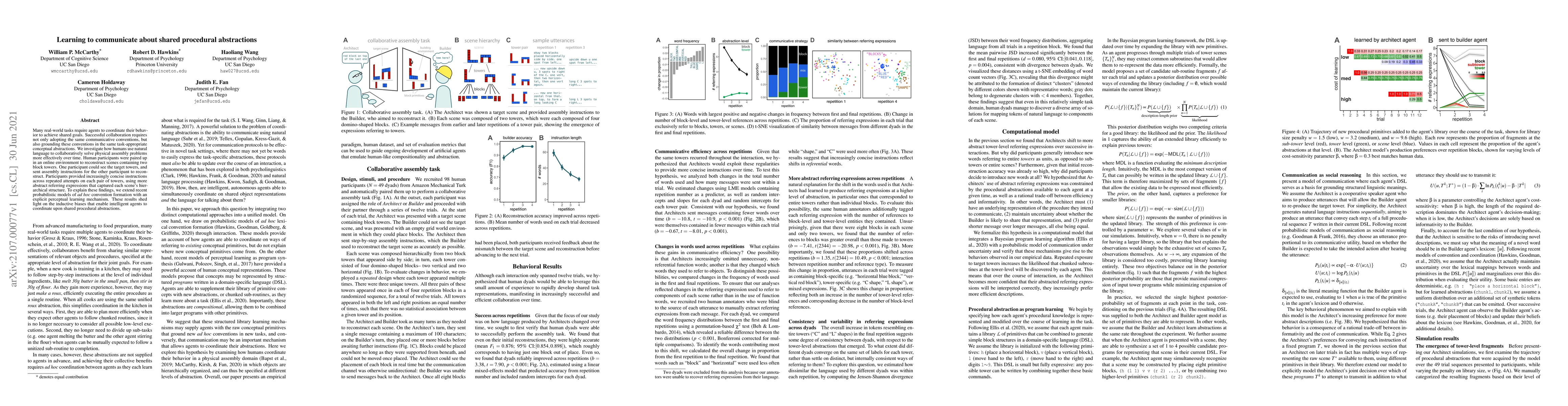 Many real-world tasks require agents to coordinate their behavior to achieve shared goals. Successful collaboration requires not only adopting the same communicative conventions, but also grounding these conventions in the same task-appropriate conceptual abstractions. We investigate how humans use natural language to collaboratively solve physical assembly problems more effectively over time. Human participants were paired up in an online environment to reconstruct scenes containing two block towers. One participant could see the target towers, and sent assembly instructions for the other participant to reconstruct. Participants provided increasingly concise instructions across repeated attempts on each pair of towers, using higher-level referring expressions that captured each scene's hierarchical structure. To explain these findings, we extend recent probabilistic models of ad-hoc convention formation with an explicit perceptual learning mechanism. These results shed light on the inductive biases that enable intelligent agents to coordinate upon shared procedural abstractions.