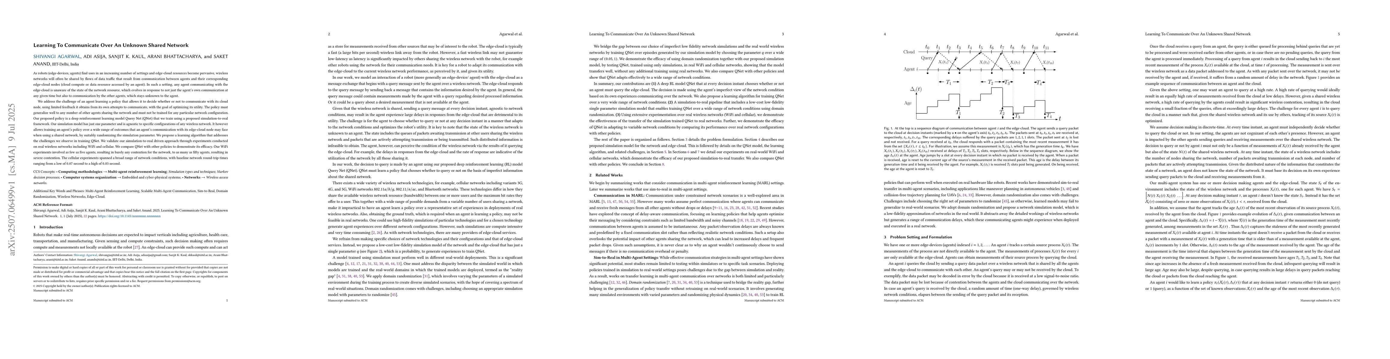 As robots (edge-devices, agents) find uses in an increasing number of settings and edge-cloud resources become pervasive, wireless networks will often be shared by flows of data traffic that result from communication between agents and corresponding edge-cloud. In such settings, agent communicating with the edge-cloud is unaware of state of network resource, which evolves in response to not just agent's own communication at any given time but also to communication by other agents, which stays unknown to the agent. We address challenge of an agent learning a policy that allows it to decide whether or not to communicate with its cloud node, using limited feedback it obtains from its own attempts to communicate, to optimize its utility. The policy generalizes well to any number of other agents sharing the network and must not be trained for any particular network configuration. Our proposed policy is a DRL model Query Net (QNet) that we train using a proposed simulation-to-real framework. Our simulation model has just one parameter and is agnostic to specific configurations of any wireless network. It allows training an agent's policy over a wide range of outcomes that an agent's communication with its edge-cloud node may face when using a shared network, by suitably randomizing the simulation parameter. We propose a learning algorithm that addresses challenges observed in training QNet. We validate our simulation-to-real driven approach through experiments conducted on real wireless networks including WiFi and cellular. We compare QNet with other policies to demonstrate its efficacy. WiFi experiments involved as few as five agents, resulting in barely any contention for the network, to as many as fifty agents, resulting in severe contention. The cellular experiments spanned a broad range of network conditions, with baseline RTT ranging from a low of 0.07 second to a high of 0.83 second.