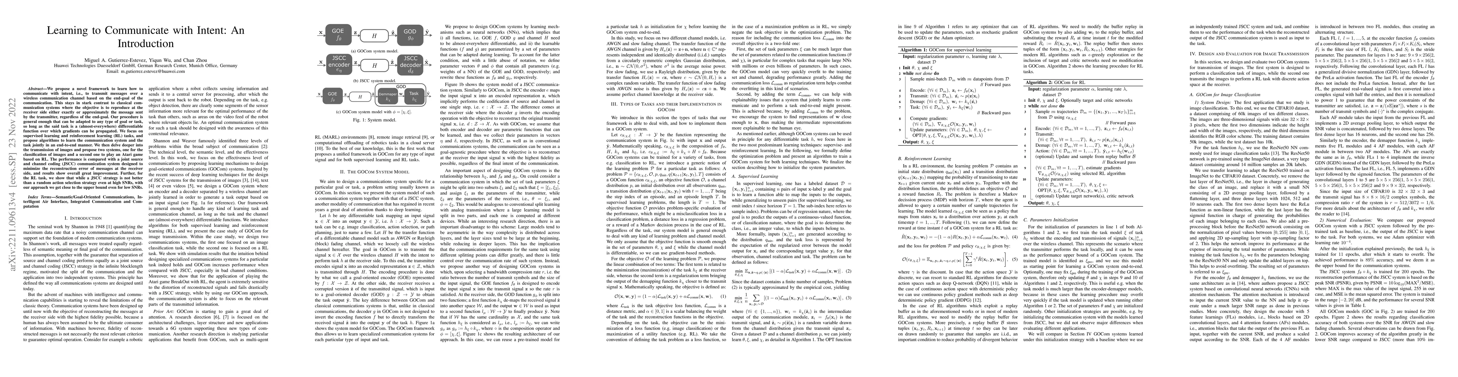 We propose a novel framework to learn how to communicate with intent, i.e., to transmit messages over a wireless communication channel based on the end-goal of the communication. This stays in stark contrast to classical communication systems where the objective is to reproduce at the receiver side either exactly or approximately the message sent by the transmitter, regardless of the end-goal. Our procedure is general enough that can be adapted to any type of goal or task, so long as the said task is a (almost-everywhere) differentiable function over which gradients can be propagated. We focus on supervised learning and reinforcement learning (RL) tasks, and propose algorithms to learn the communication system and the task jointly in an end-to-end manner. We then delve deeper into the transmission of images and propose two systems, one for the classification of images and a second one to play an Atari game based on RL. The performance is compared with a joint source and channel coding (JSCC) communication system designed to minimize the reconstruction error of messages at the receiver side, and results show overall great improvement. Further, for the RL task, we show that while a JSCC strategy is not better than a random action selection strategy even at high SNRs, with our approach we get close to the upper bound even for low SNRs.