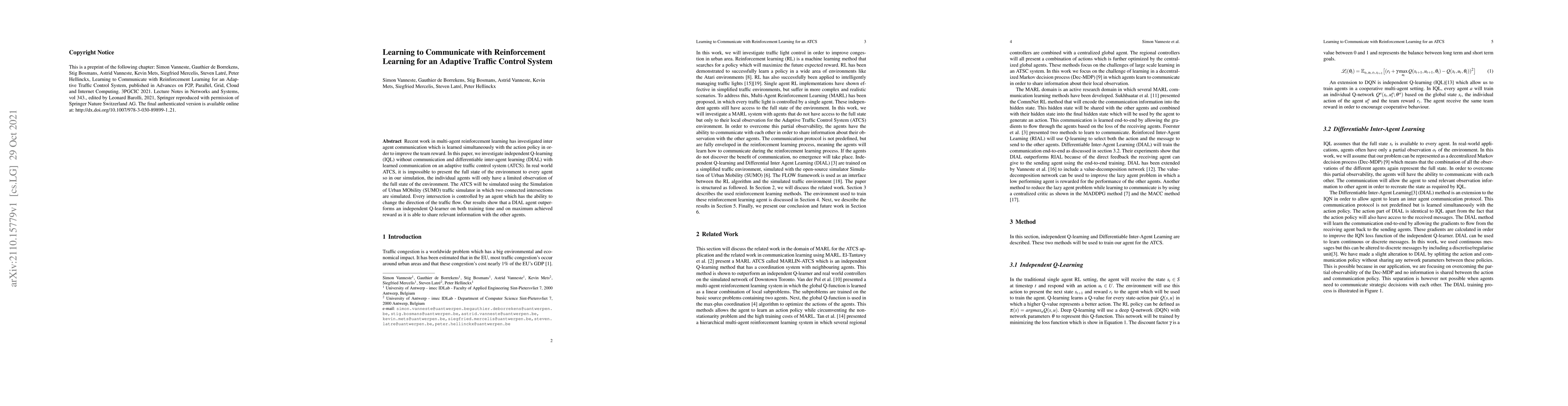 Recent work in multi-agent reinforcement learning has investigated inter agent communication which is learned simultaneously with the action policy in order to improve the team reward. In this paper, we investigate independent Q-learning (IQL) without communication and differentiable inter-agent learning (DIAL) with learned communication on an adaptive traffic control system (ATCS). In real world ATCS, it is impossible to present the full state of the environment to every agent so in our simulation, the individual agents will only have a limited observation of the full state of the environment. The ATCS will be simulated using the Simulation of Urban MObility (SUMO) traffic simulator in which two connected intersections are simulated. Every intersection is controlled by an agent which has the ability to change the direction of the traffic flow. Our results show that a DIAL agent outperforms an independent Q-learner on both training time and on maximum achieved reward as it is able to share relevant information with the other agents.