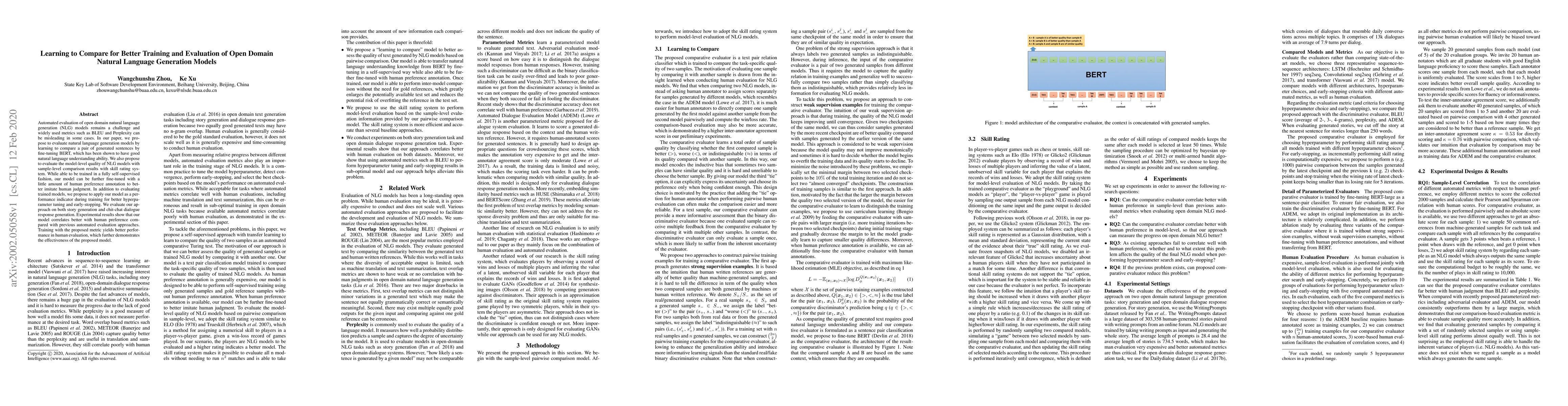 This paper proposes a new method for evaluating open domain natural language generation models by learning to compare generated sentences using fine-tuned BERT, showing better correlation with human preference than traditional metrics. The proposed approach also aids in model training through performance indicators and early-stopping.