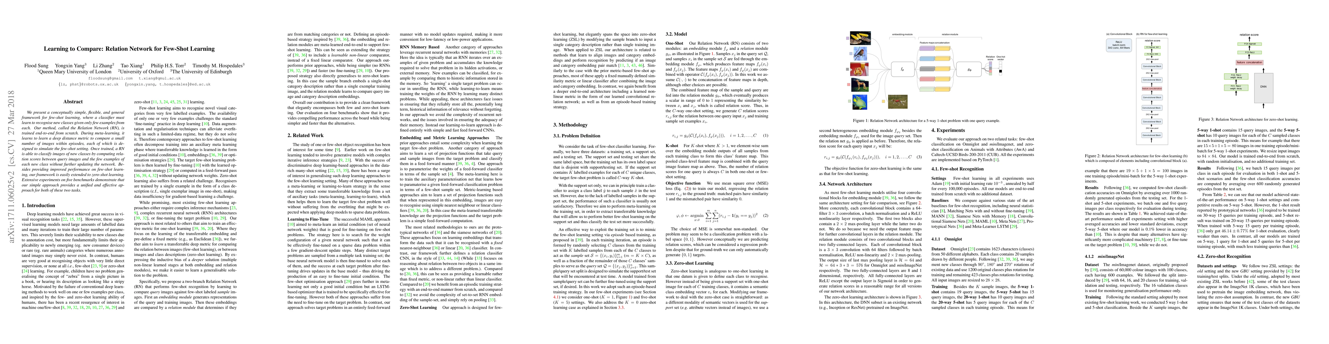 We present a conceptually simple, flexible, and general framework for few-shot learning, where a classifier must learn to recognise new classes given only few examples from each. Our method, called the Relation Network (RN), is trained end-to-end from scratch. During meta-learning, it learns to learn a deep distance metric to compare a small number of images within episodes, each of which is designed to simulate the few-shot setting. Once trained, a RN is able to classify images of new classes by computing relation scores between query images and the few examples of each new class without further updating the network. Besides providing improved performance on few-shot learning, our framework is easily extended to zero-shot learning. Extensive experiments on five benchmarks demonstrate that our simple approach provides a unified and effective approach for both of these two tasks.
