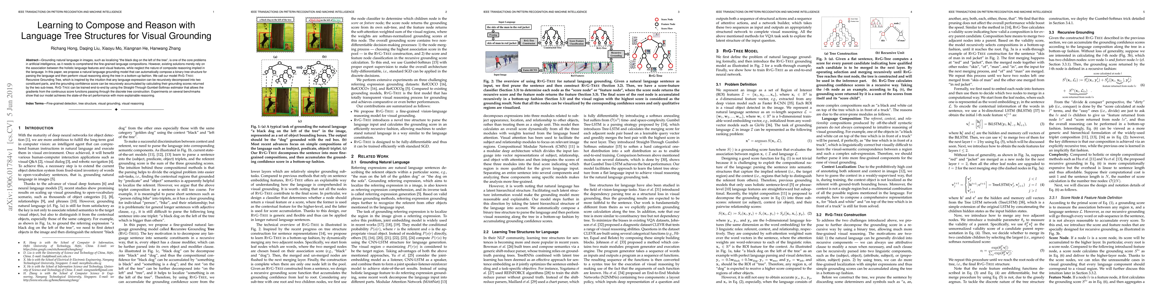 This paper introduces RVG-TREE, a model that constructs binary tree structures for parsing and reasoning with compositional language to ground it in images, achieving state-of-the-art performance by recursively decomposing language into constituent parts and accumulating grounding scores. The model is trained end-to-end using a Straight-Through Gumbel-Softmax estimator.
