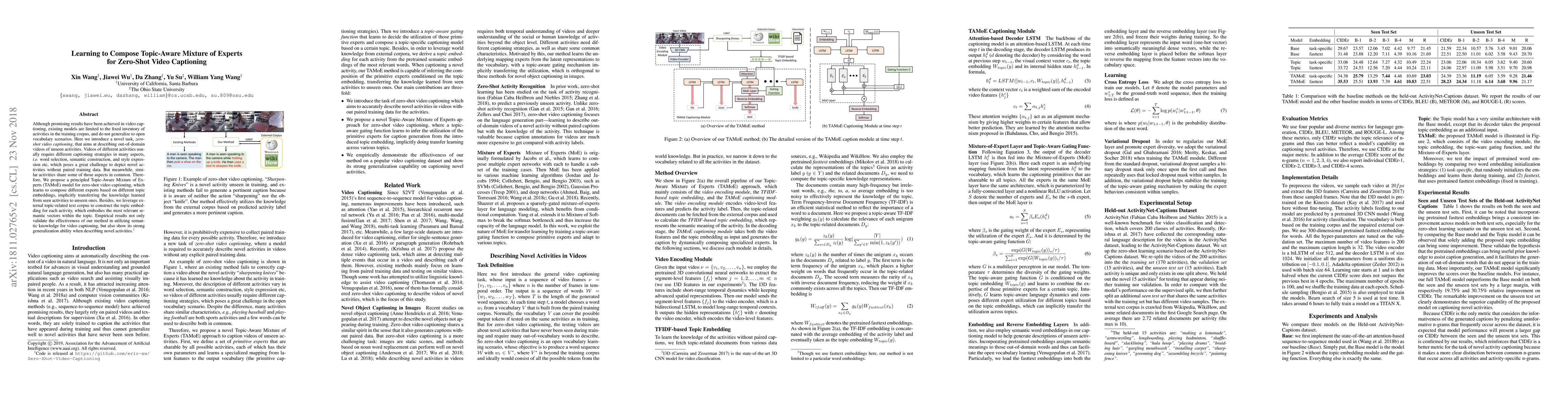 This paper introduces a Topic-Aware Mixture of Experts (TAMoE) model for zero-shot video captioning, enabling the description of unseen activities by transferring knowledge from seen activities. The model leverages topic embeddings derived from external text corpora to generalize captioning strategies effectively.